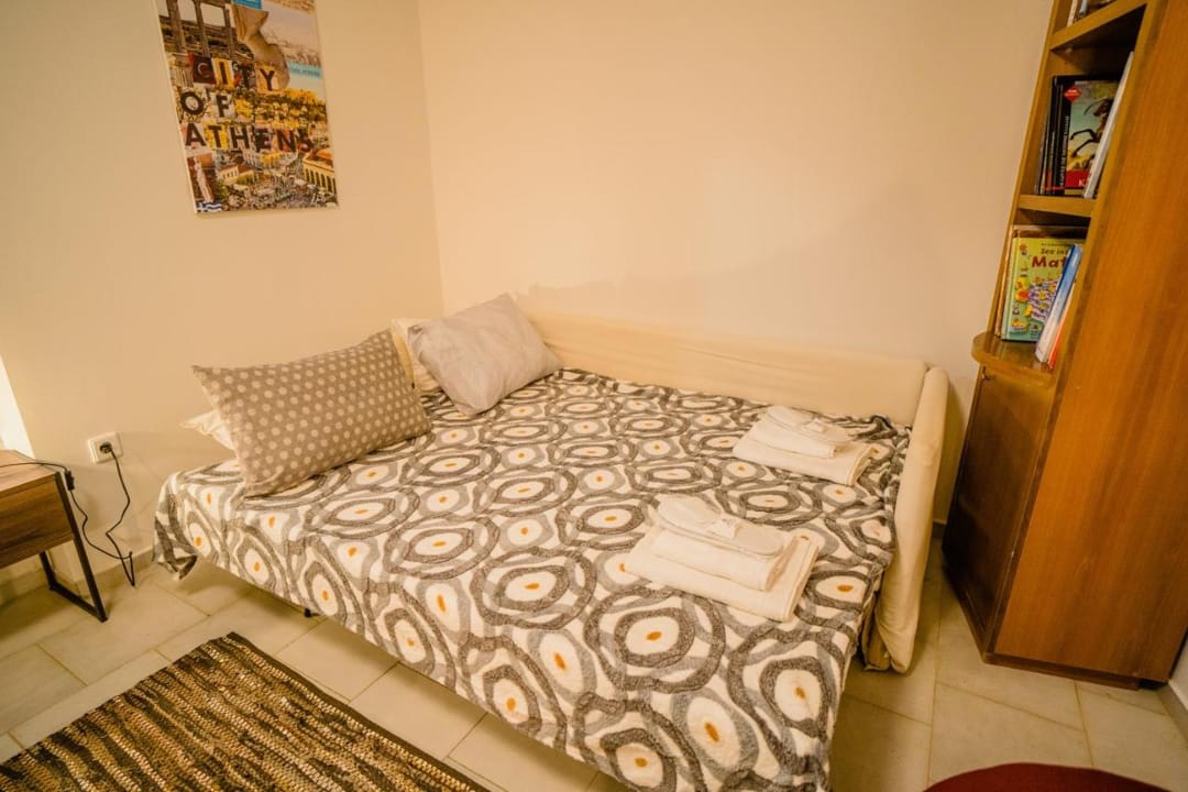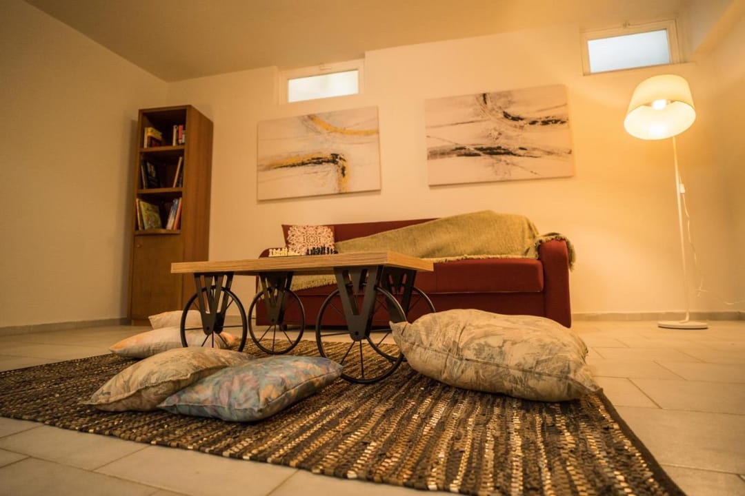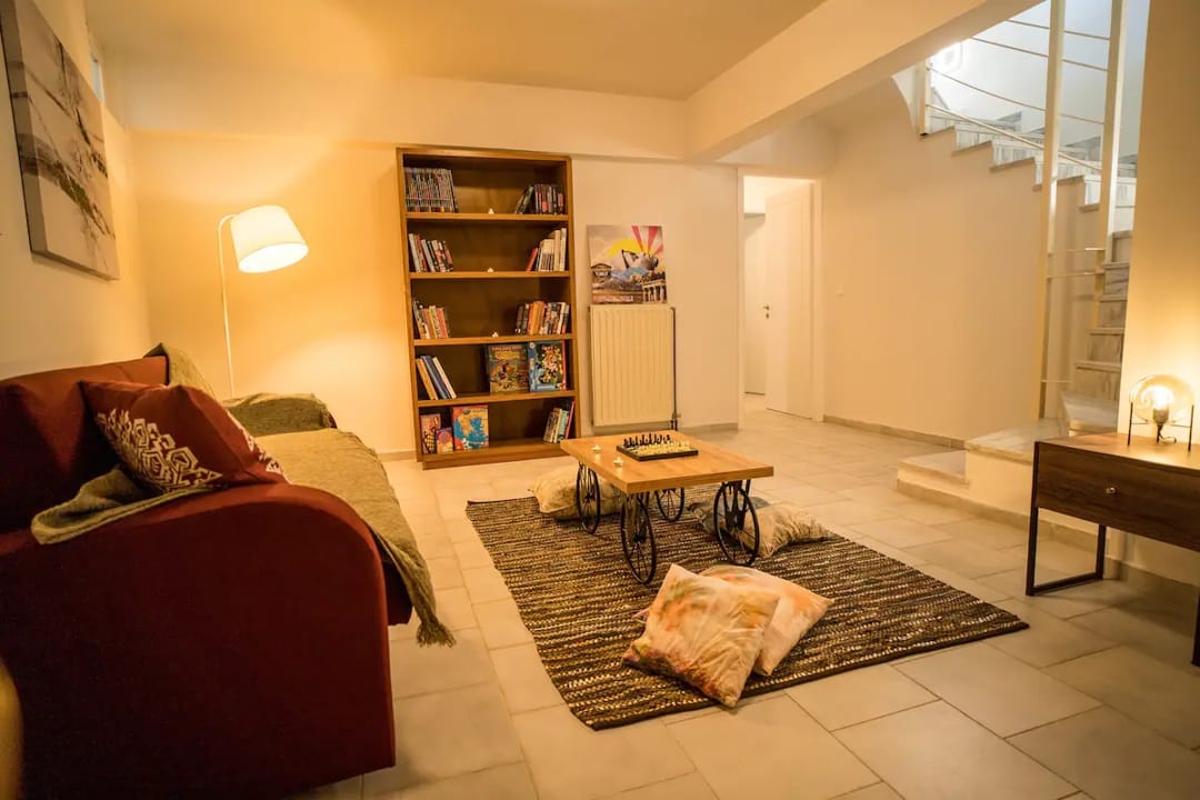 - Spacious living room with a two-seater sofa that becomes a bed, desk, library, and space for games and reading