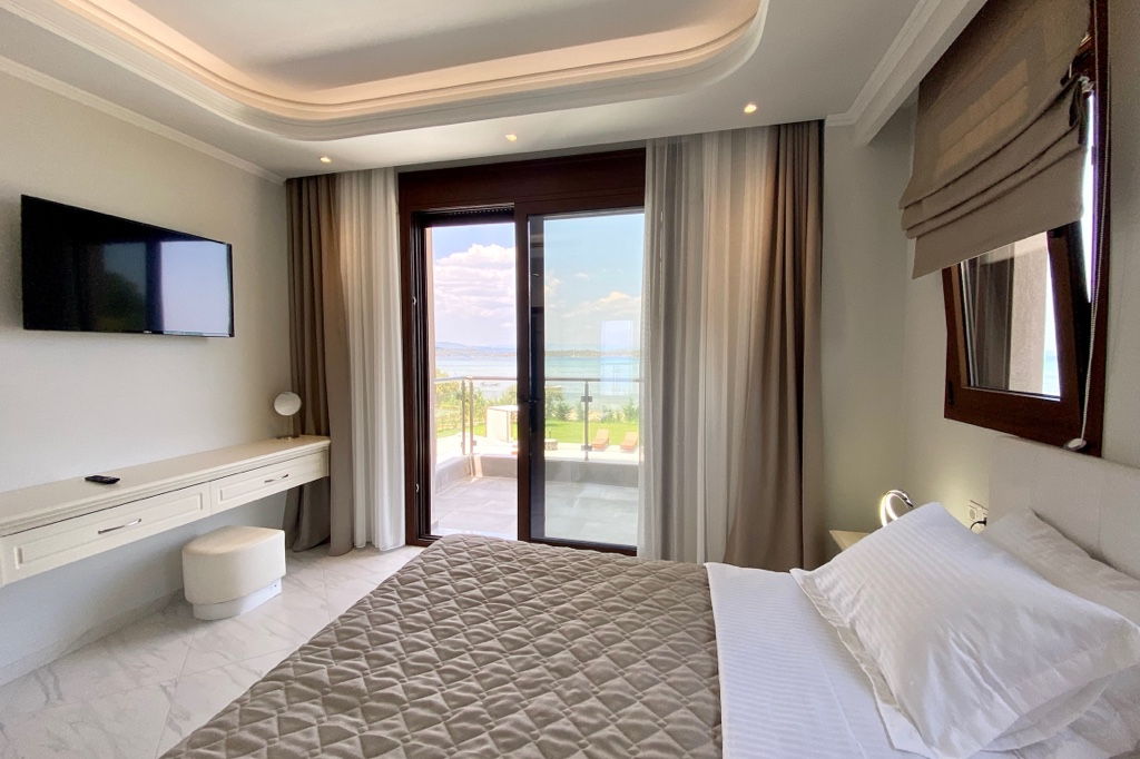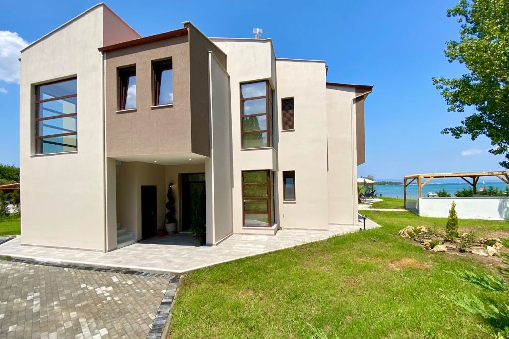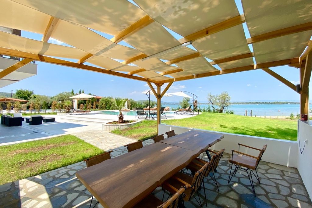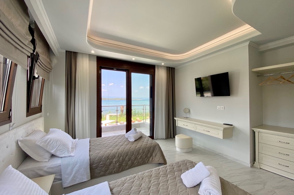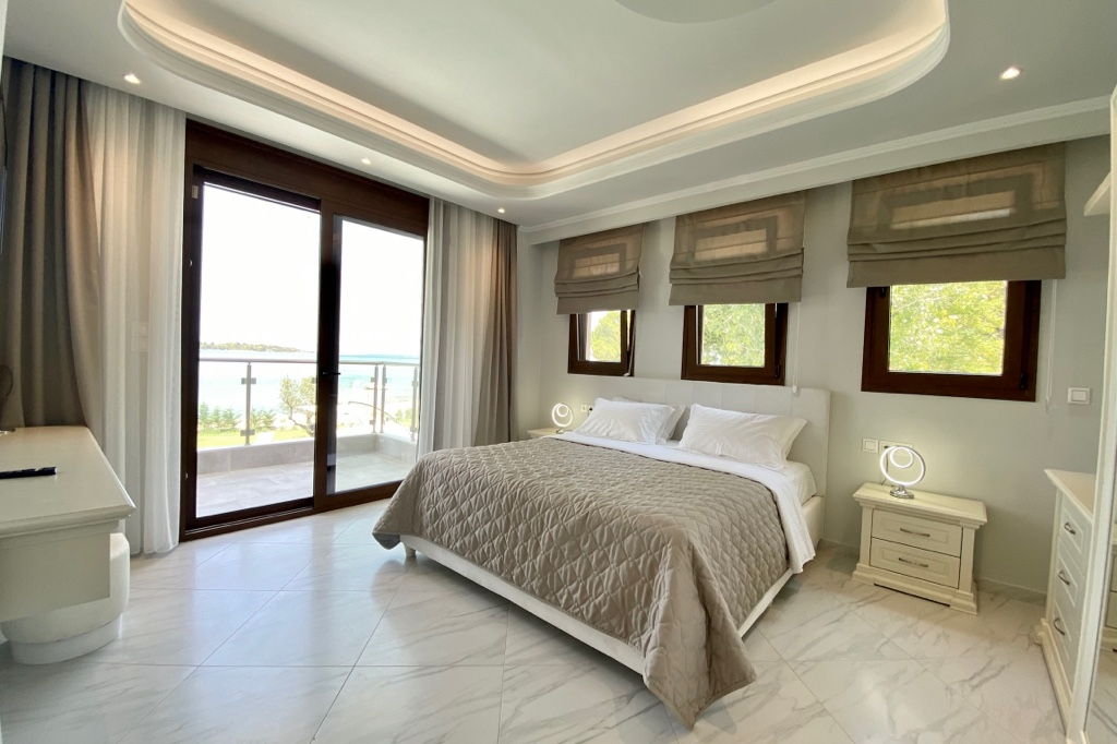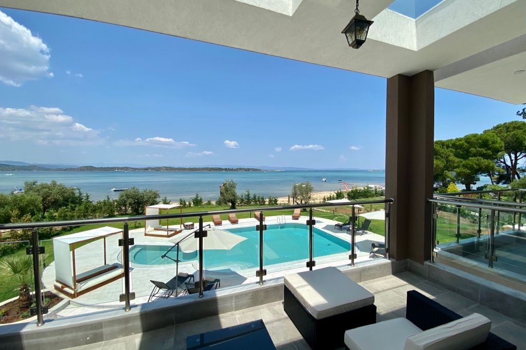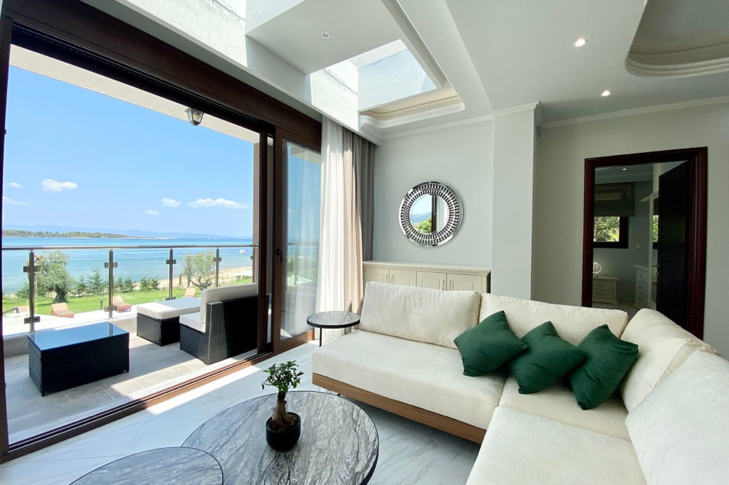 The new luxury beachfront villa Scarlet with 4 bedrooms and a private pool, is just 10 meters from the sandy beach in the picturesque green village of Vourvourou, on the peninsula of Sithonia, Halkidiki for rent.