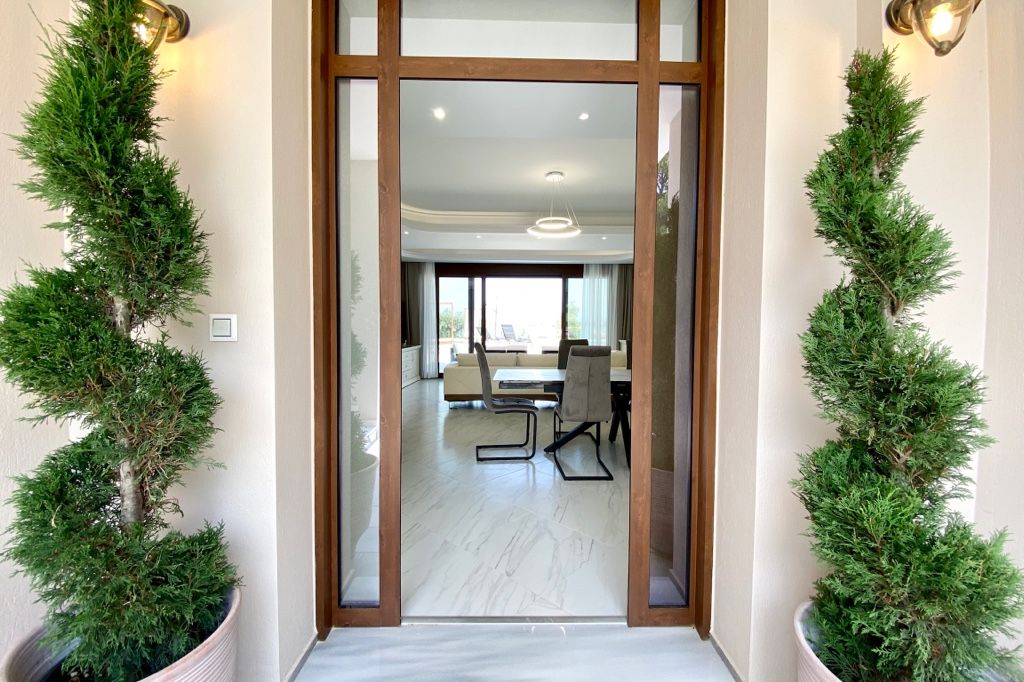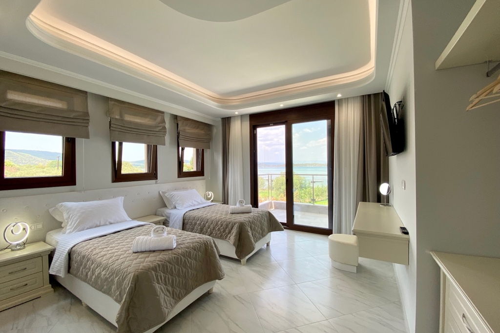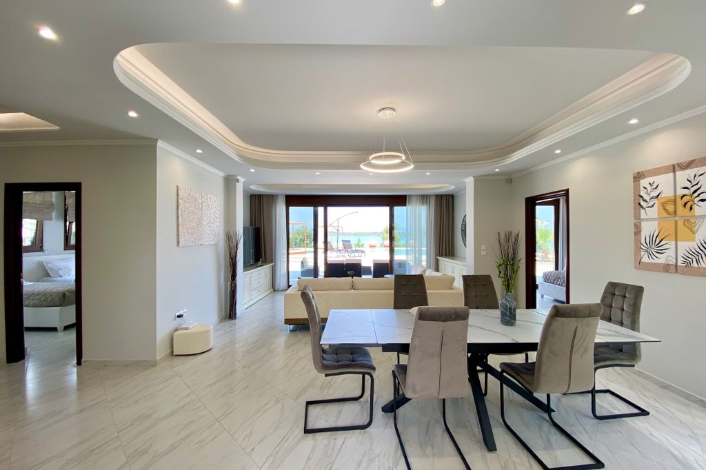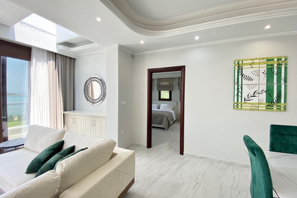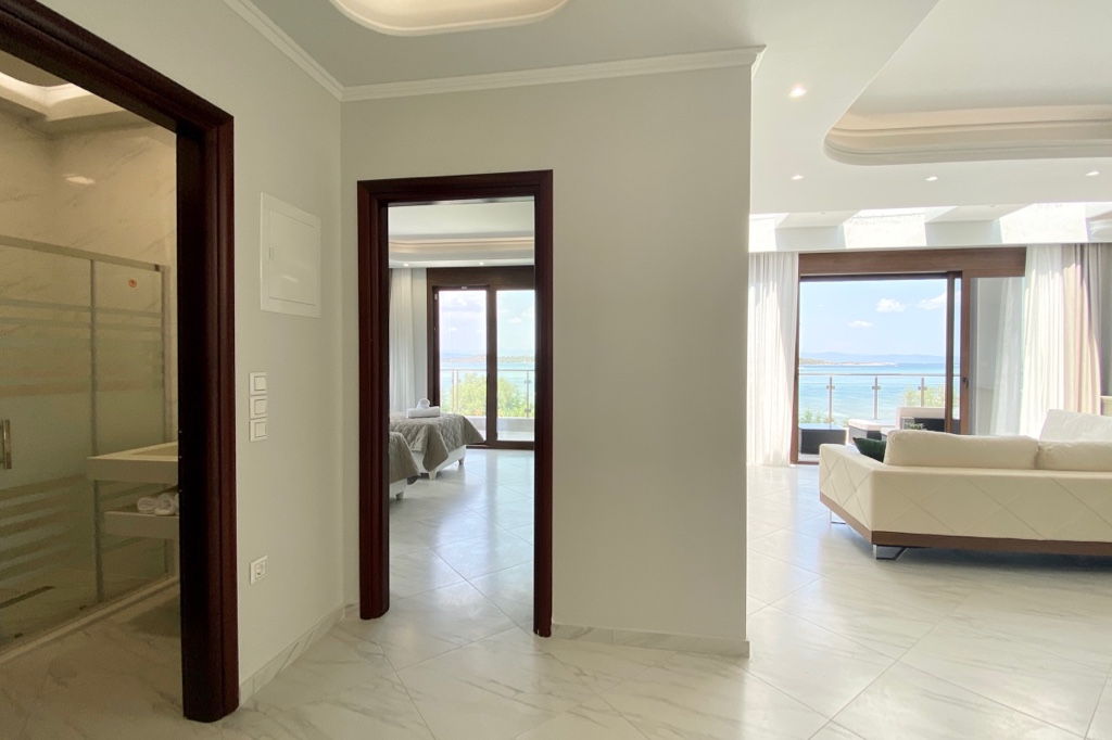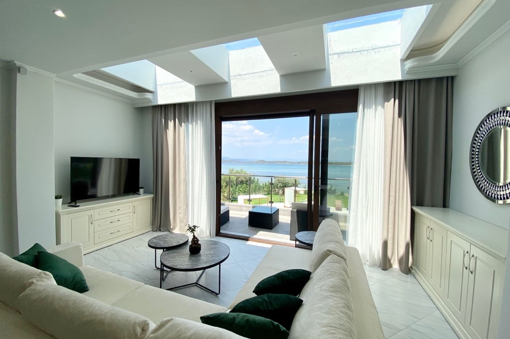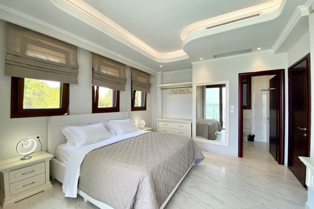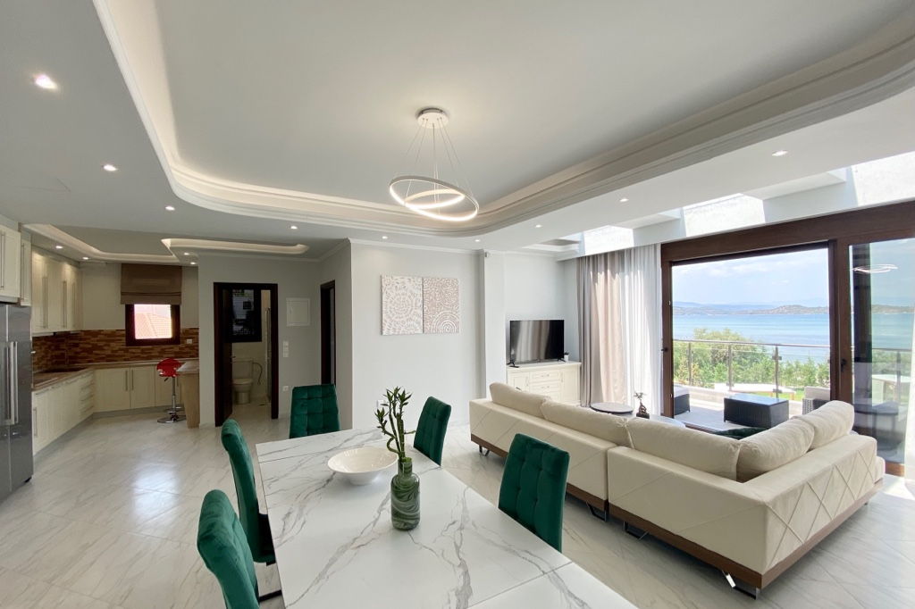 The new luxury beachfront villa Scarlet with 4 bedrooms and a private pool, is just 10 meters from the sandy beach in the picturesque green village of Vourvourou, on the peninsula of Sithonia, Halkidiki for rent.
