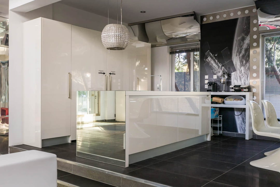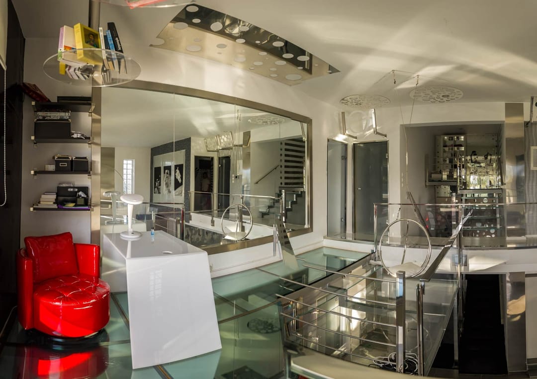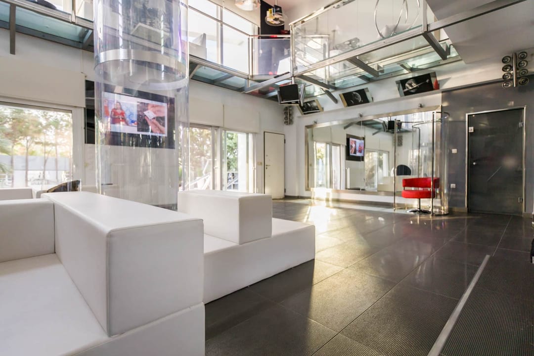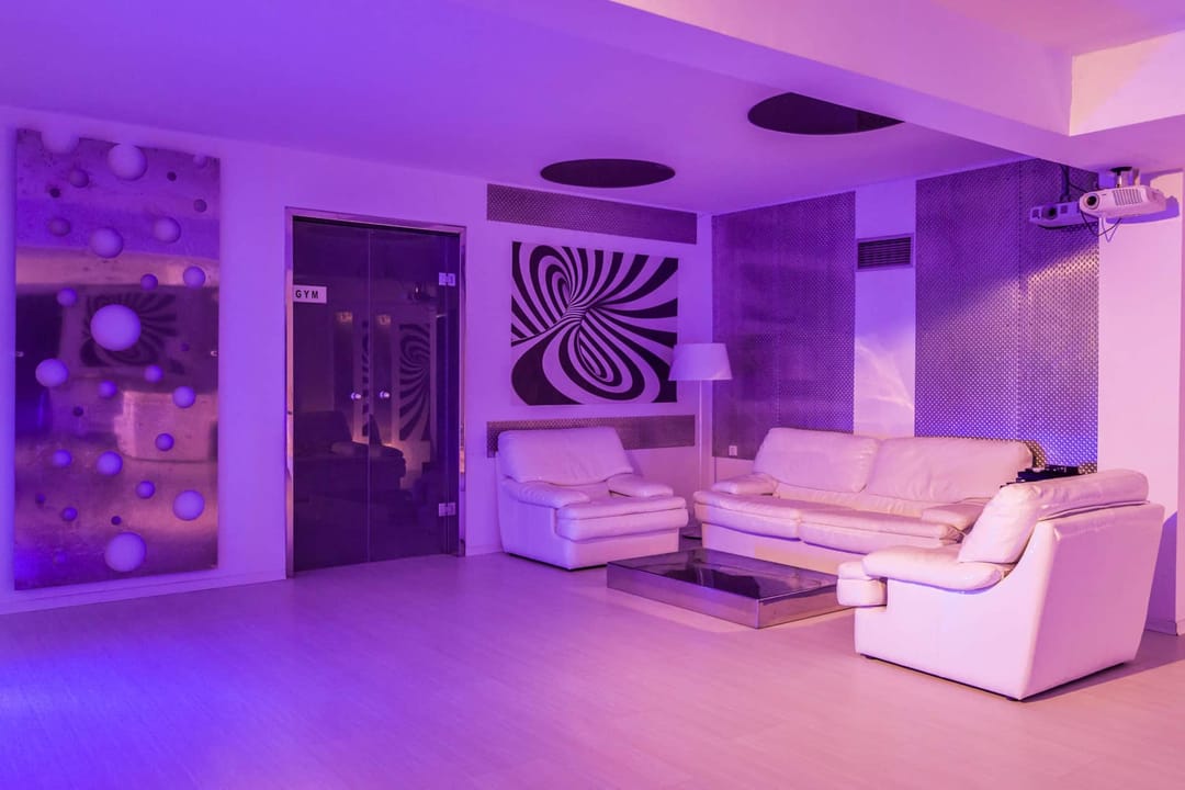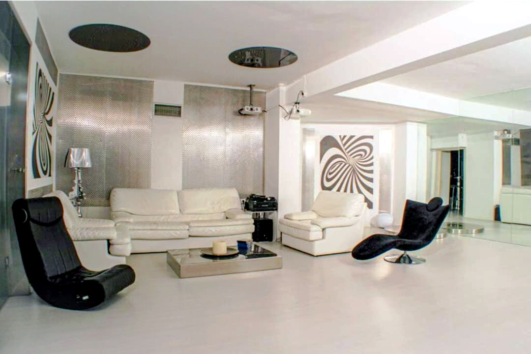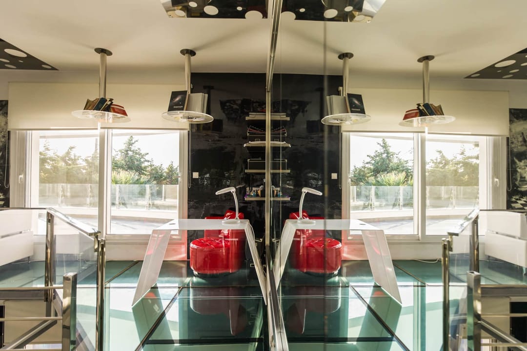 The interior decoration is based on a unique raster from absolute white to absolute black. With round beds, inox elements, glass doors, mirrors, glass floors, meteorites, home cinema, huge gym, play room with billiards and many TVs for the guests of the villa.