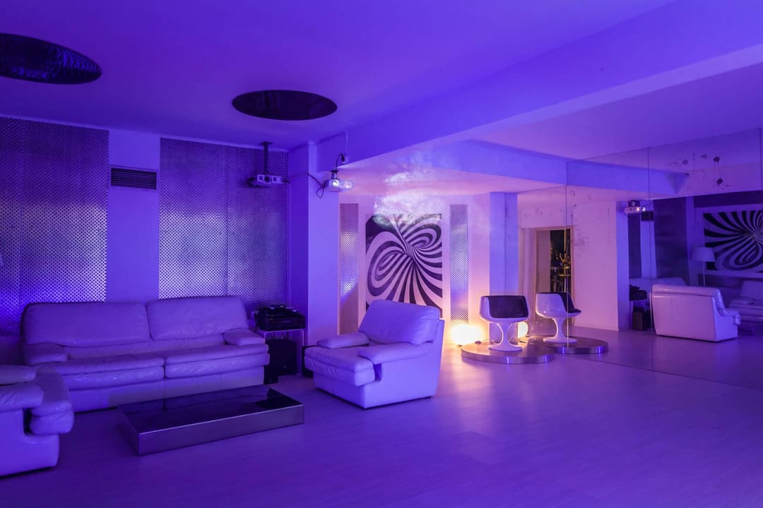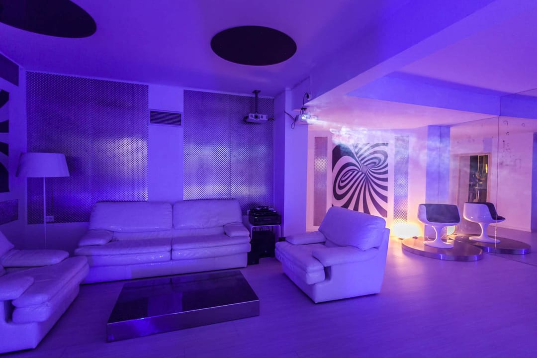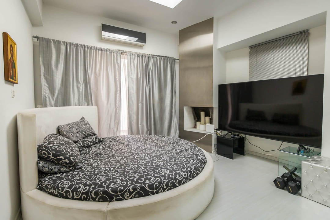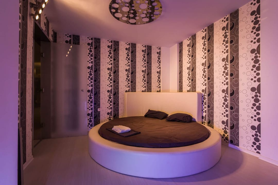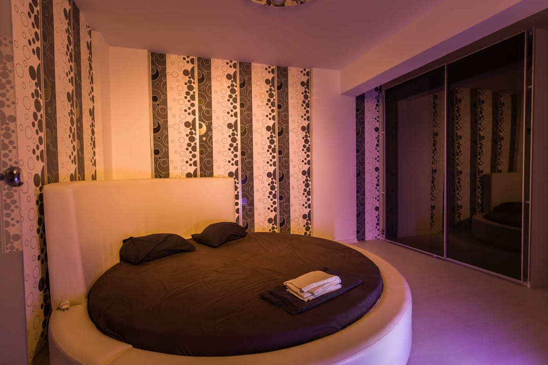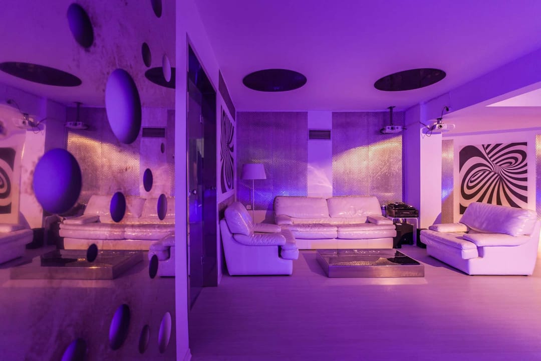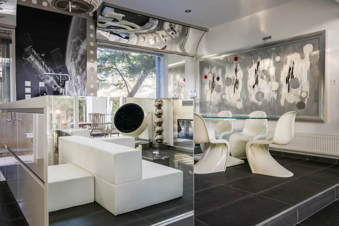 The interior decoration is based on a unique raster from absolute white to absolute black. With round beds, inox elements, glass doors, mirrors, glass floors, meteorites, home cinema, huge gym, play room with billiards and many TVs for the guests of the villa.