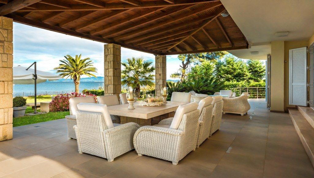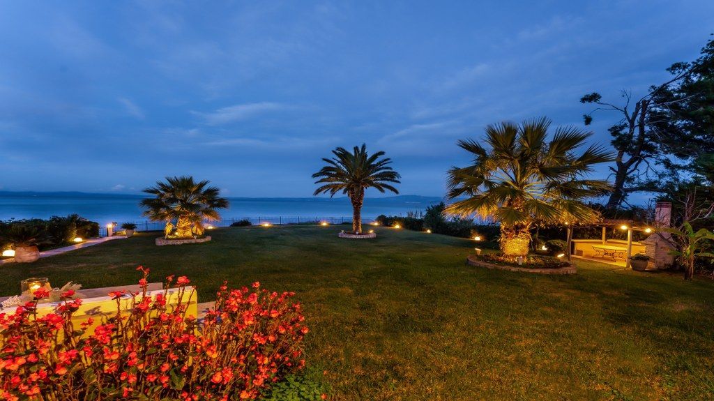 This luxury summer mansion is located in a quiet, peaceful place, between two popular tourist villages of Hanioti and Polichrono. The place is famous for its long sandy beach and beautiful sea. Access to the sea is through the private gate, with sunbeds and umbrellas on the beach.