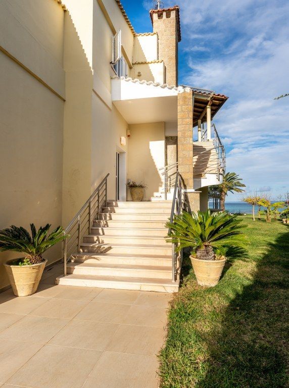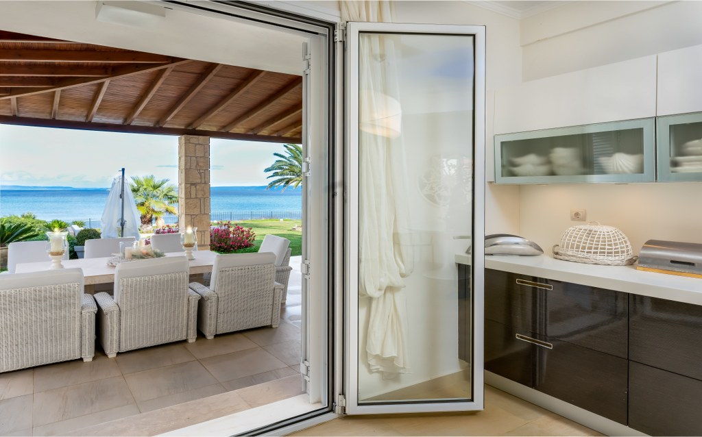 Stunning seafront villa Sia with 5 bedrooms with a limitless sea view surrounded by palm trees on a large green plot, in front of the beach, on the peninsula of Kassandra, Halkidiki, for rent.