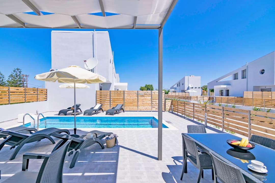 Comfortable modern villa Stridi with 3 bedrooms and a private pool, on the long sand and pebble beach, near the picturesque town of Rethymno, on the island of Crete, for rent.
