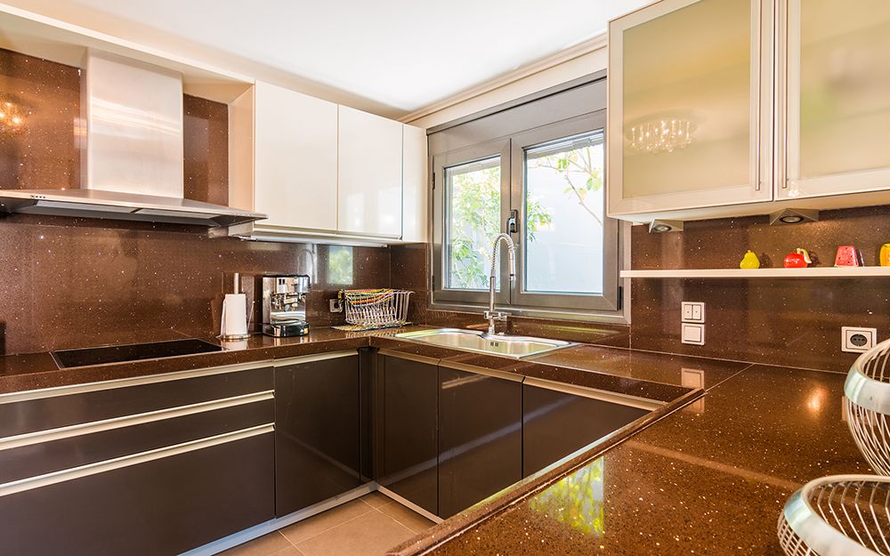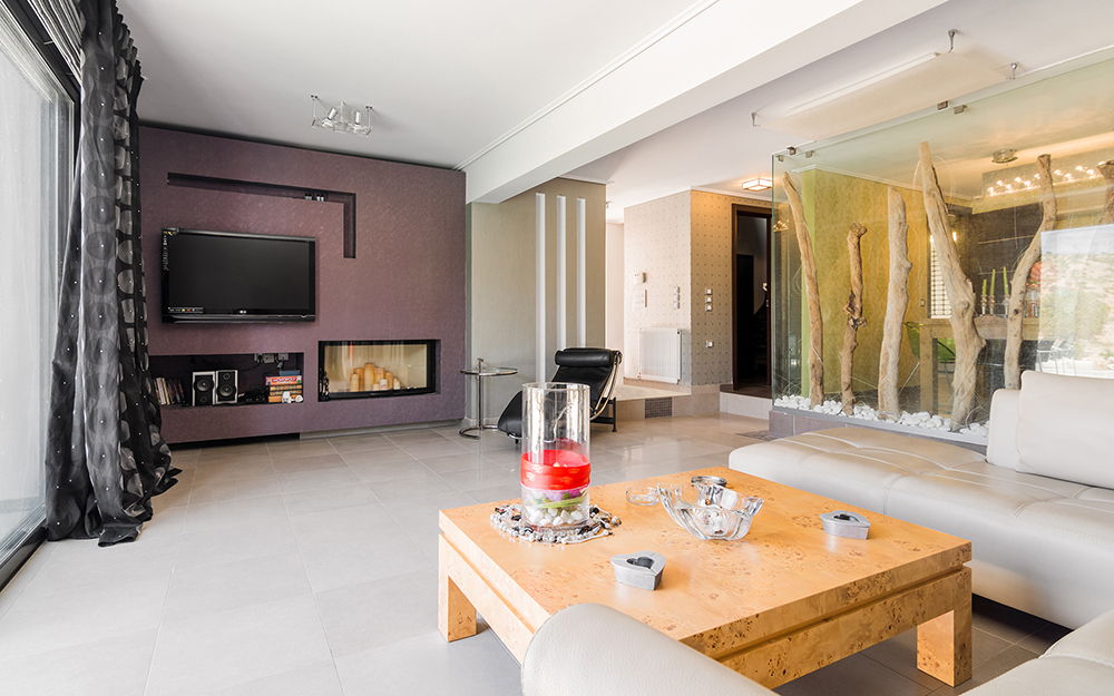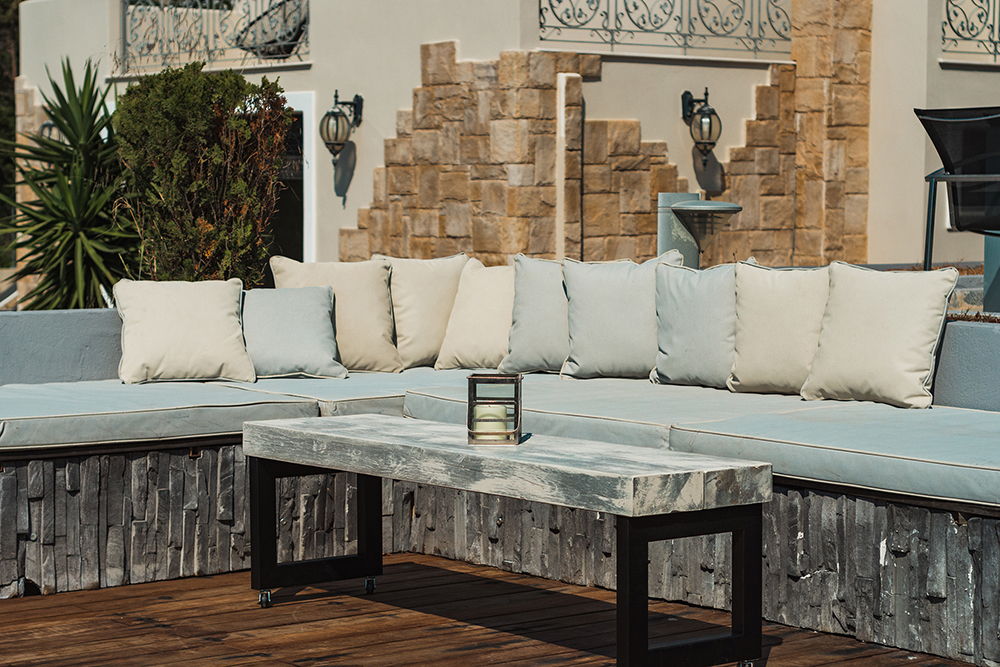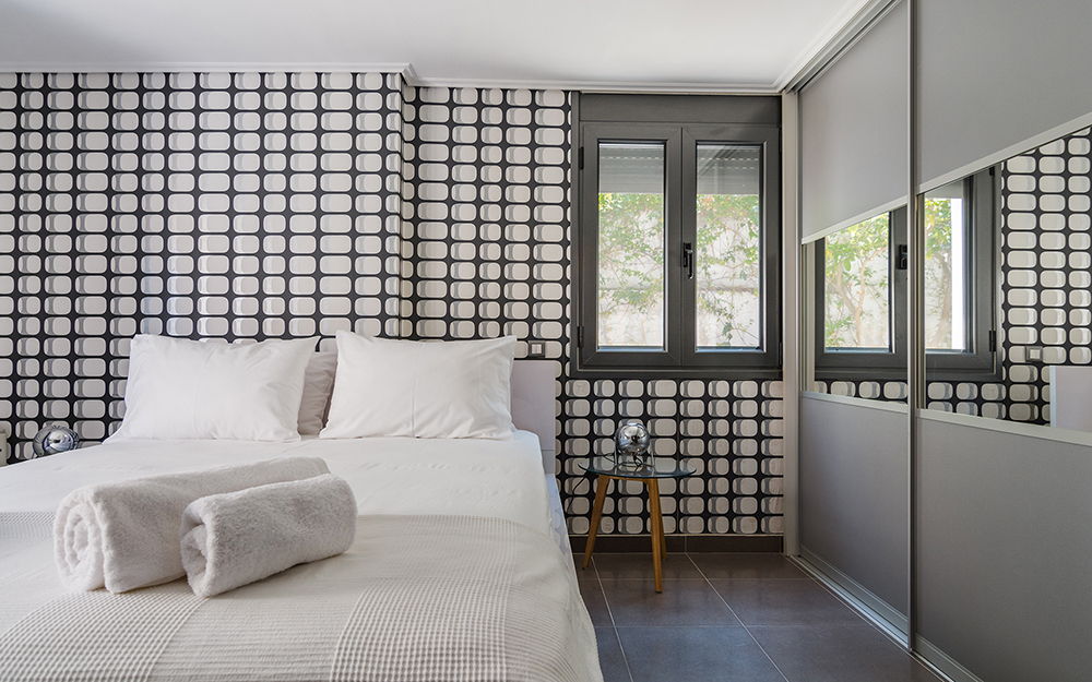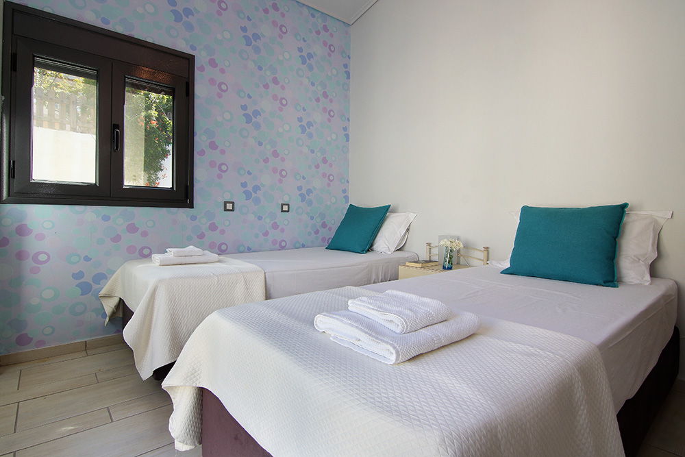 Villa Teo provides all the modern comforts so that its guests can fully enjoy every moment of their getaway. The design and decor are simple and modern yet warm and refreshing and, at the same time, create an ambiance of elegance and coziness. Pastel tones have been selected for the walls to discreetly match the off-white leather couch, while decorative items and furniture playfully add colorful bright nuances. The contemporary furniture along with the black chaise-longue and the lighting radiate a refined modern atmosphere. Large windows that lead directly to the swimming pool create an airy feeling in the living room. At the same time, the adjacent dining area and a fully equipped kitchen are ideal for guests who enjoy gatherings and preparing dinner together.