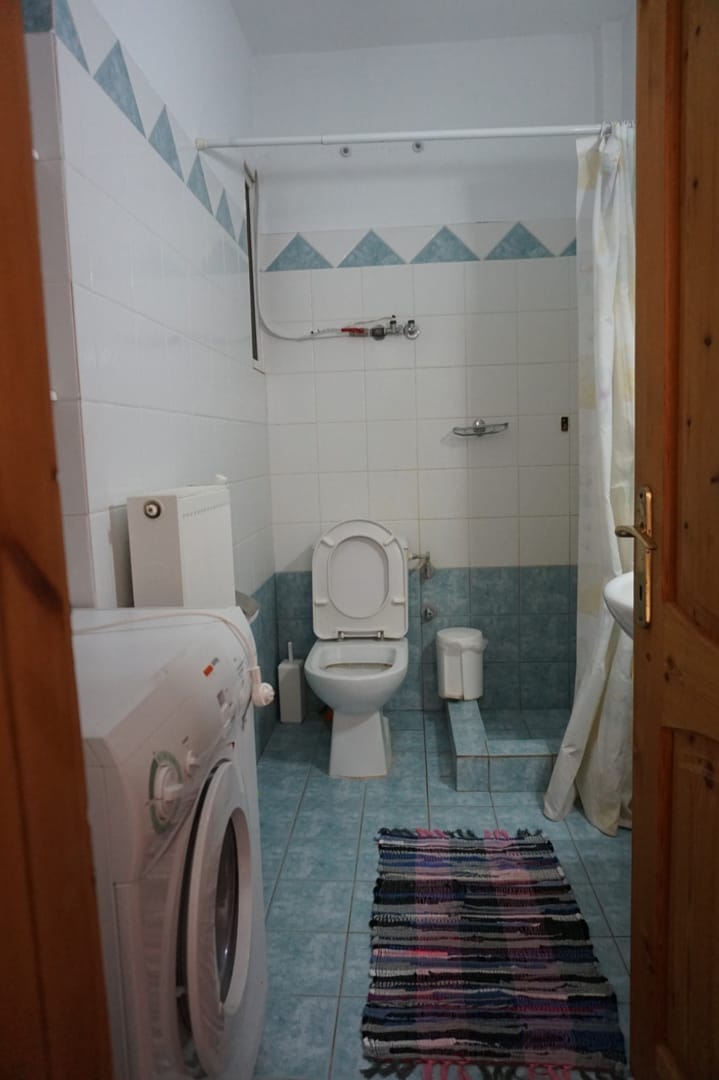 • Refrigerator/freezer, cooker, oven, coffee maker, electric kettle, toaster, 2 large cupboards with all kitchen appliances and utensils