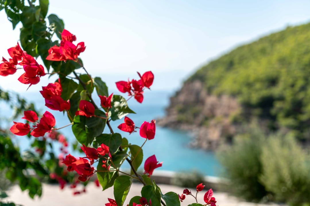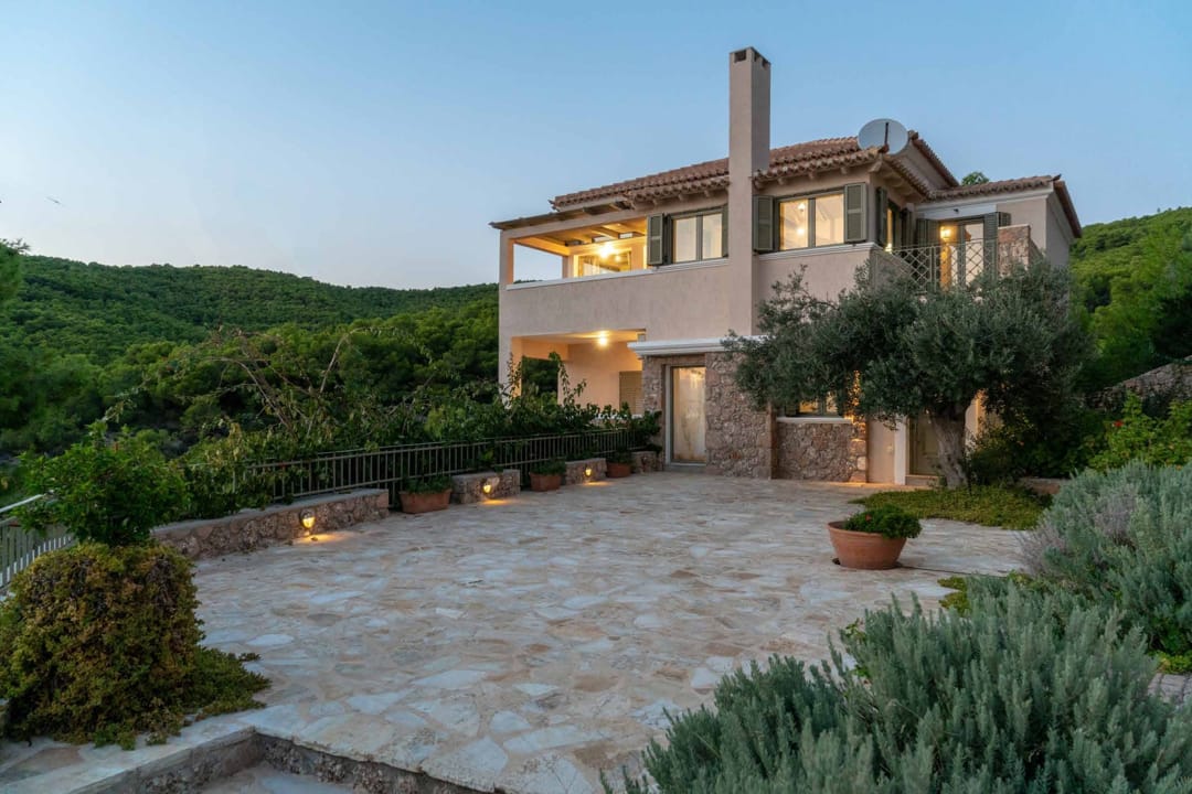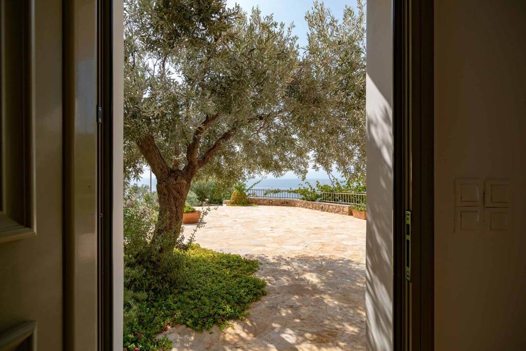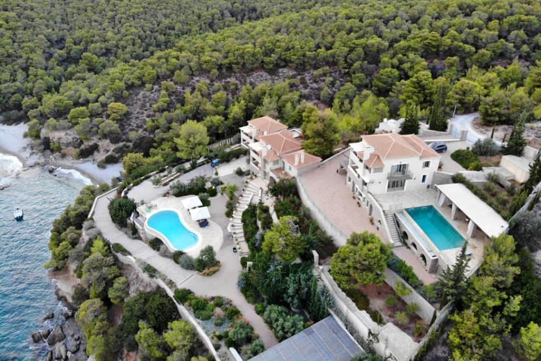 The villa is located in a complex of three luxurious villas, each with its separate entrance, driveway, private grounds, and gardens. The feature of these amazing villas is their unique location, just above a natural secluded cove, surrounded by lush green forest, with incredible views of the Aegean Sea and pine forest.