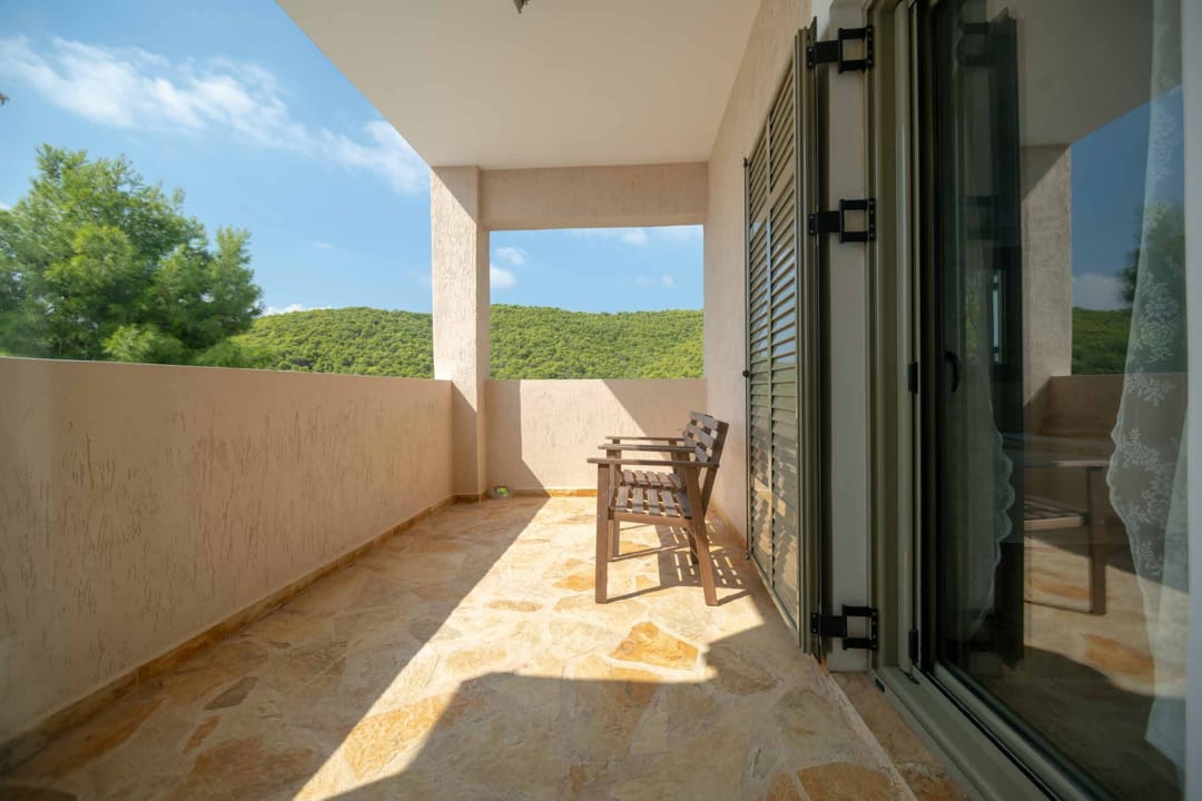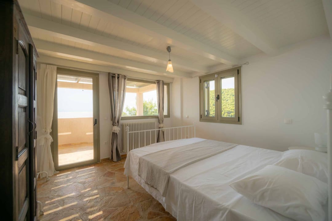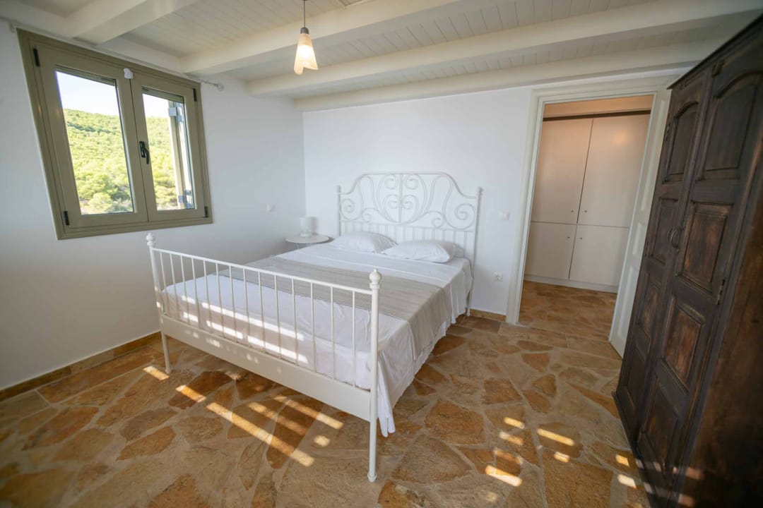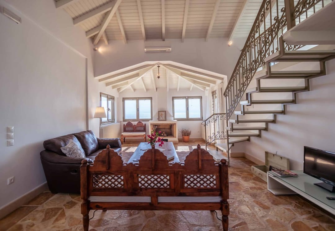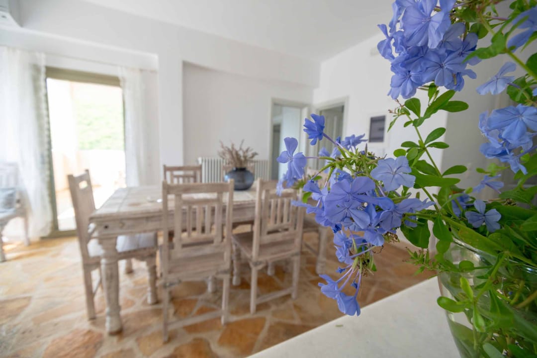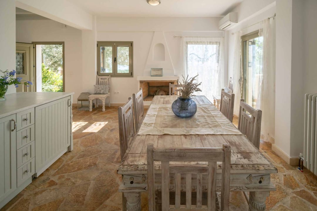 The architecture of the villas is based on the traditional style of the area, using materials that blend beautifully with the surroundings. The interiors are furnished with handcrafted traditional pieces. The minimalist approach allows guests to relax and enjoy the unique views of the Aegean Sea, nearby islands, and the adjacent forest. Ample and spacious living areas with large dining areas and comfortable leather sofas create an ideal environment for feasting and enjoying quiet moments.