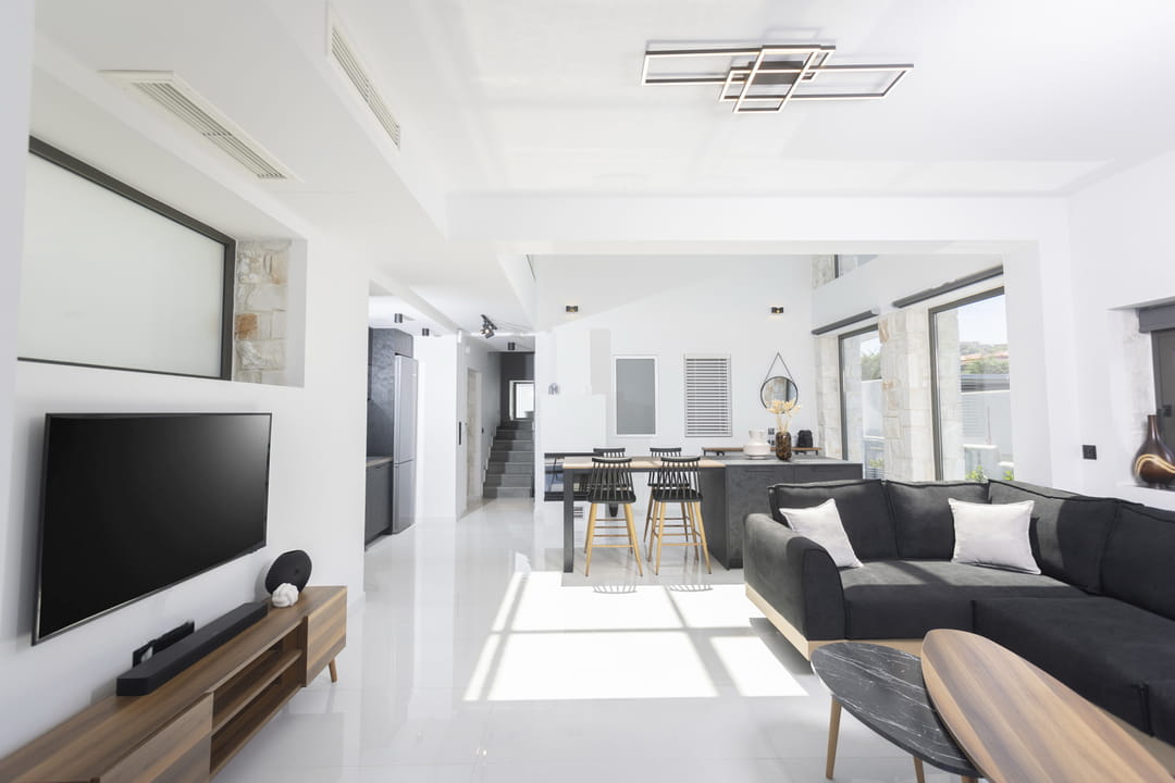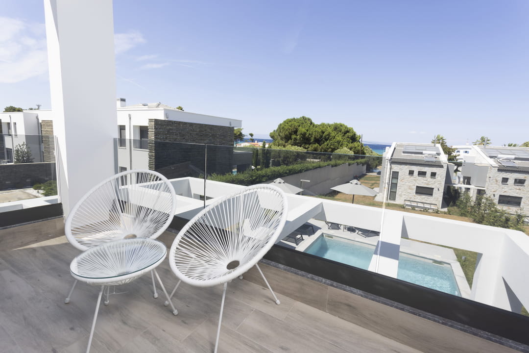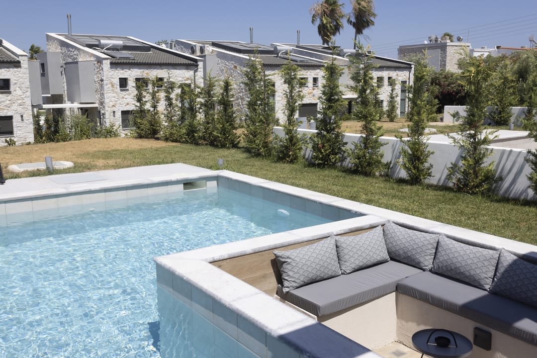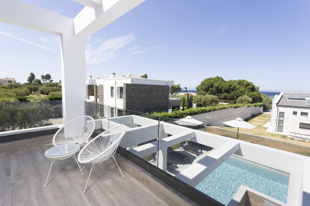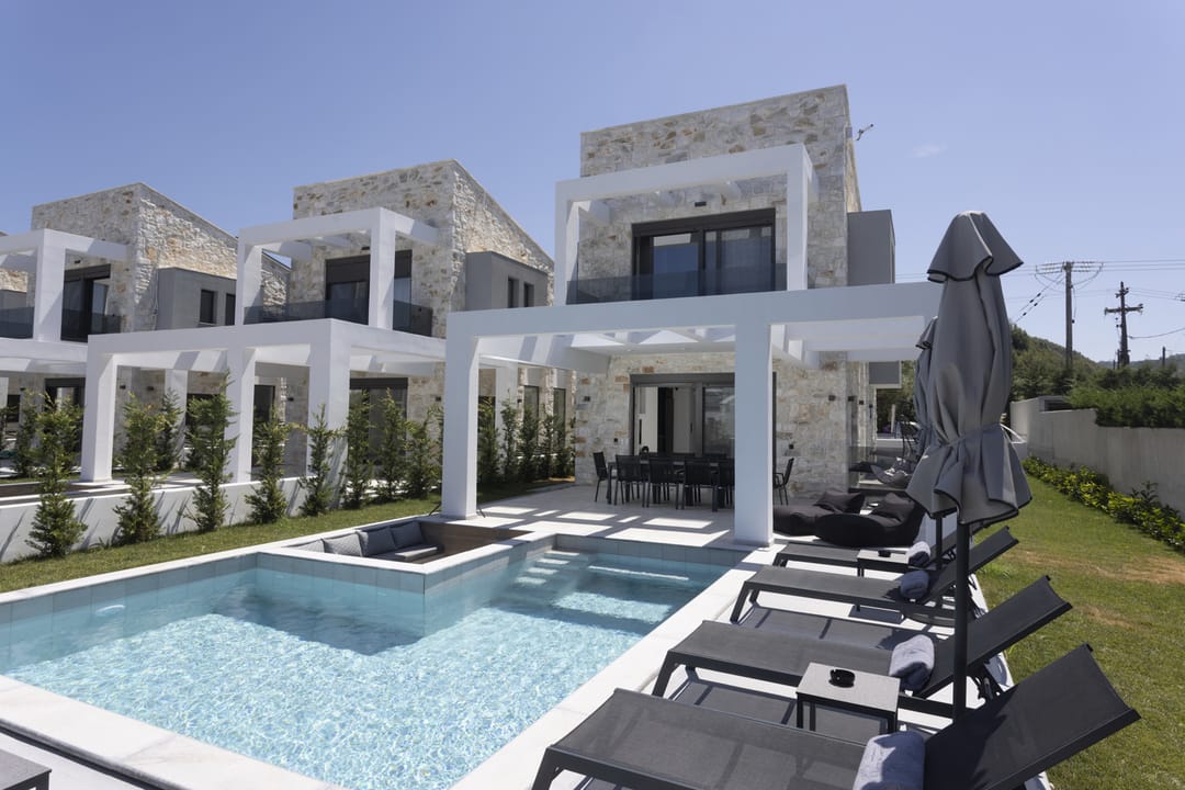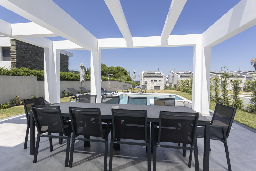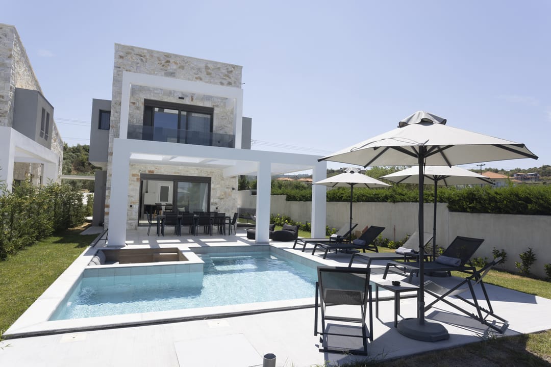Stylish New Villa Wind with 5 bedrooms, a private pool, and a charming patio, located just 150 meters from the beach, close to the popular resort town of Hanioti on the Kassandra Peninsula, Halkidiki, for rent.
