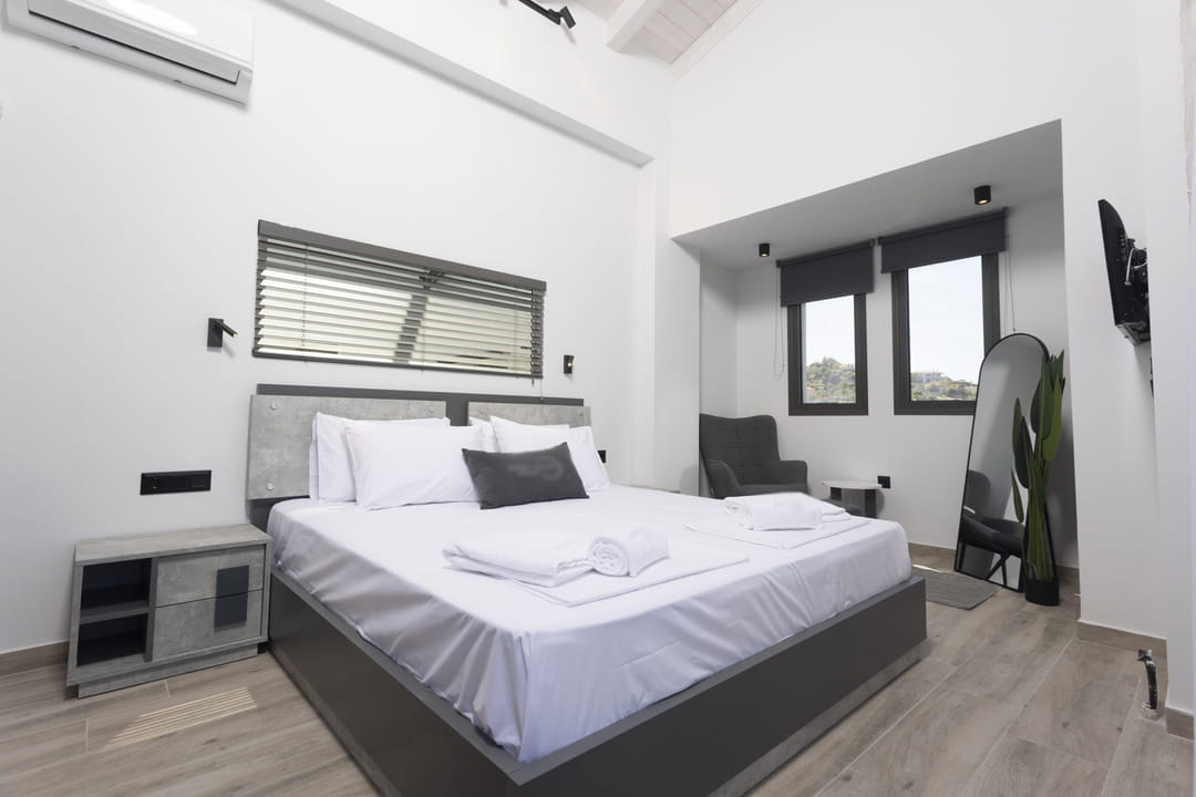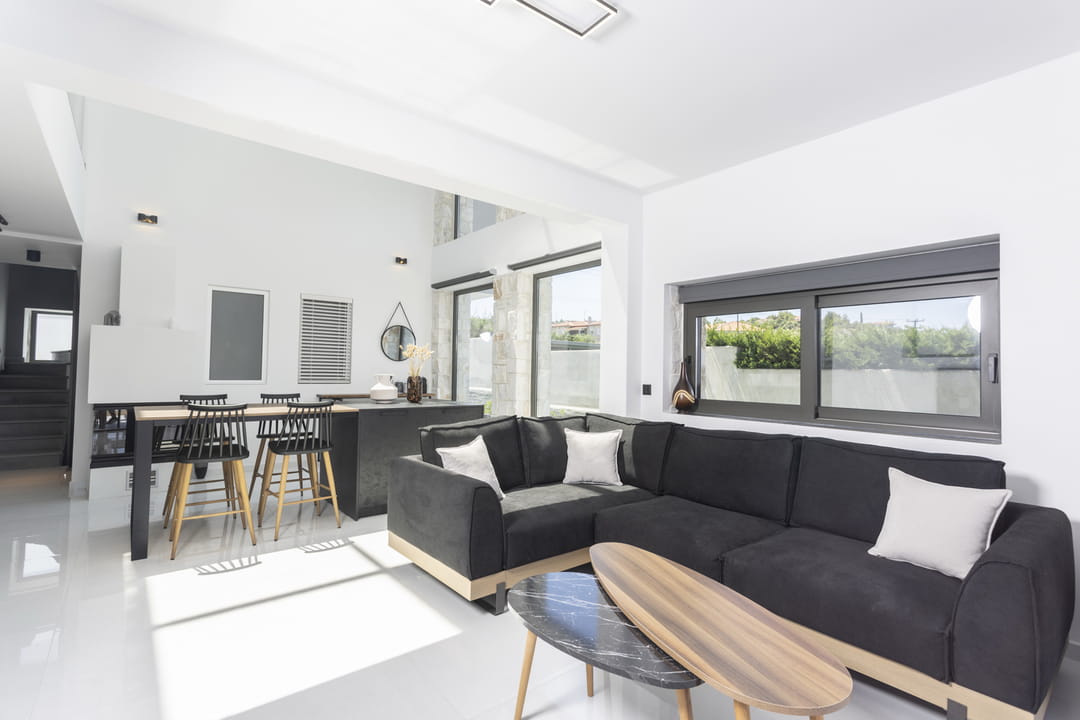 The spacious, comfortable villa is part of a complex of eight villas, each with its own swimming pool. Guests will appreciate the villa’s modern amenities and stylish décor. A long, sandy beach dotted with small pebbles is just a 2-minute stroll away. The beach is unorganized. At a distance of 250 meters, there is a small beach bar. The popular tourist hub of Hanioti is just 1 kilometer away, boasting a variety of shops, taverns, and cafes. The villa’s location ensures a tranquil and peaceful atmosphere, ideal for unwinding and enjoying the surrounding beauty.