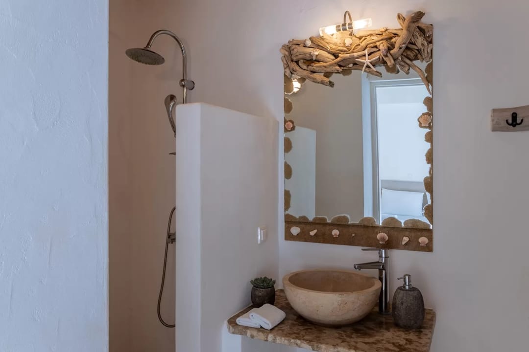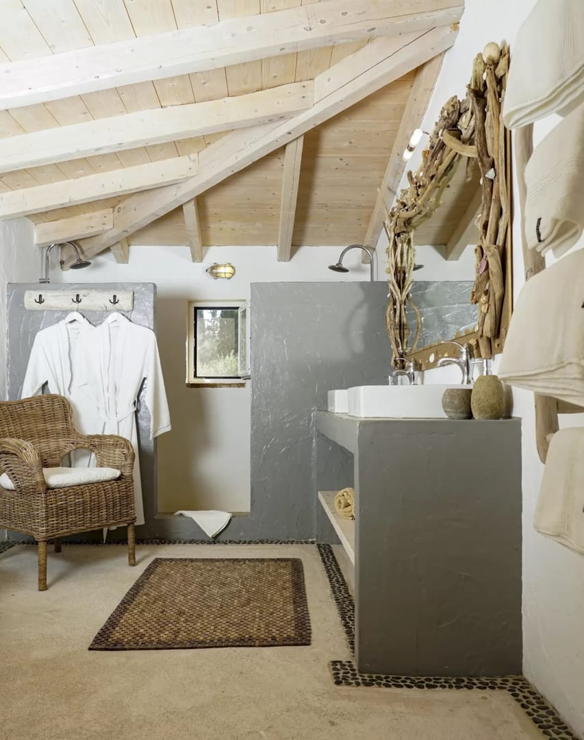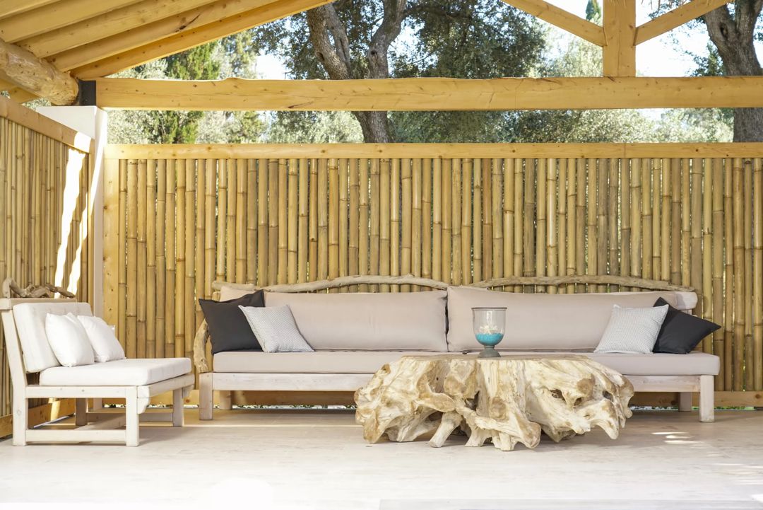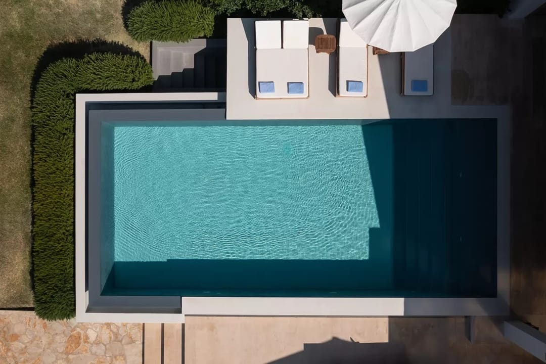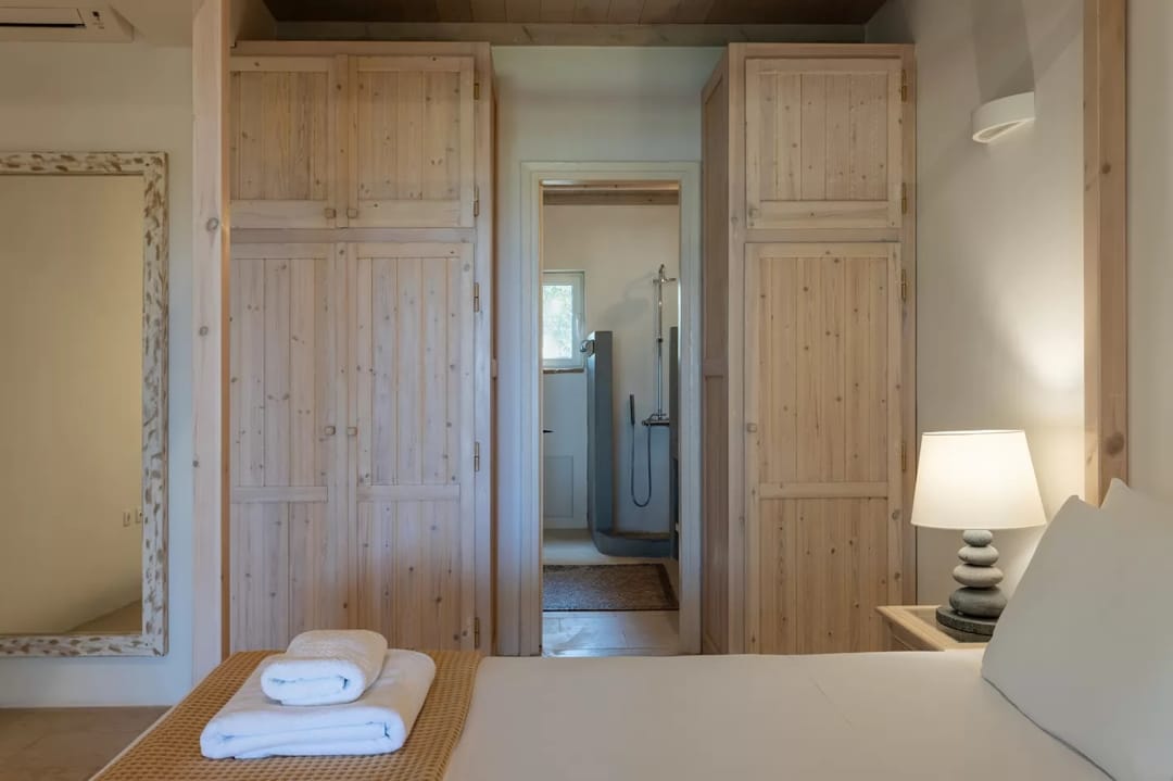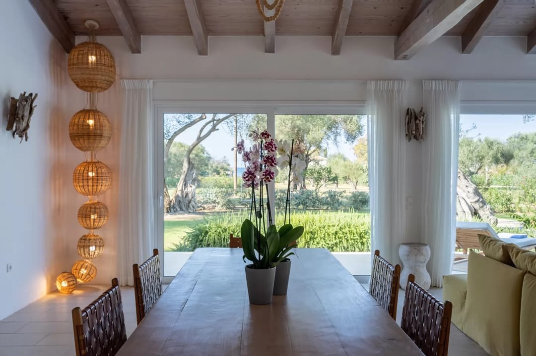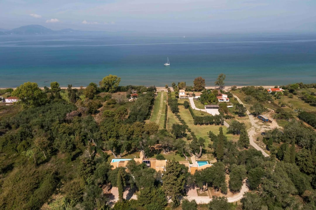 The villa is located within an exclusive beachfront estate comprising three finely crafted villas, nestled in a landscape characterized by ancient olive trees.