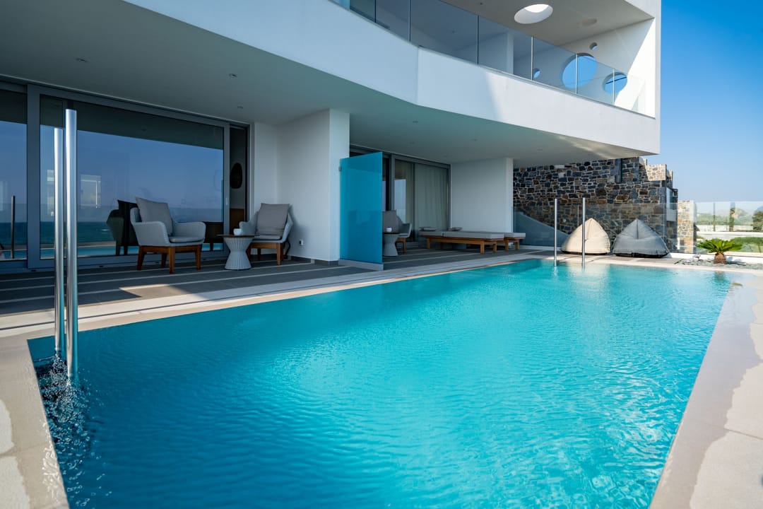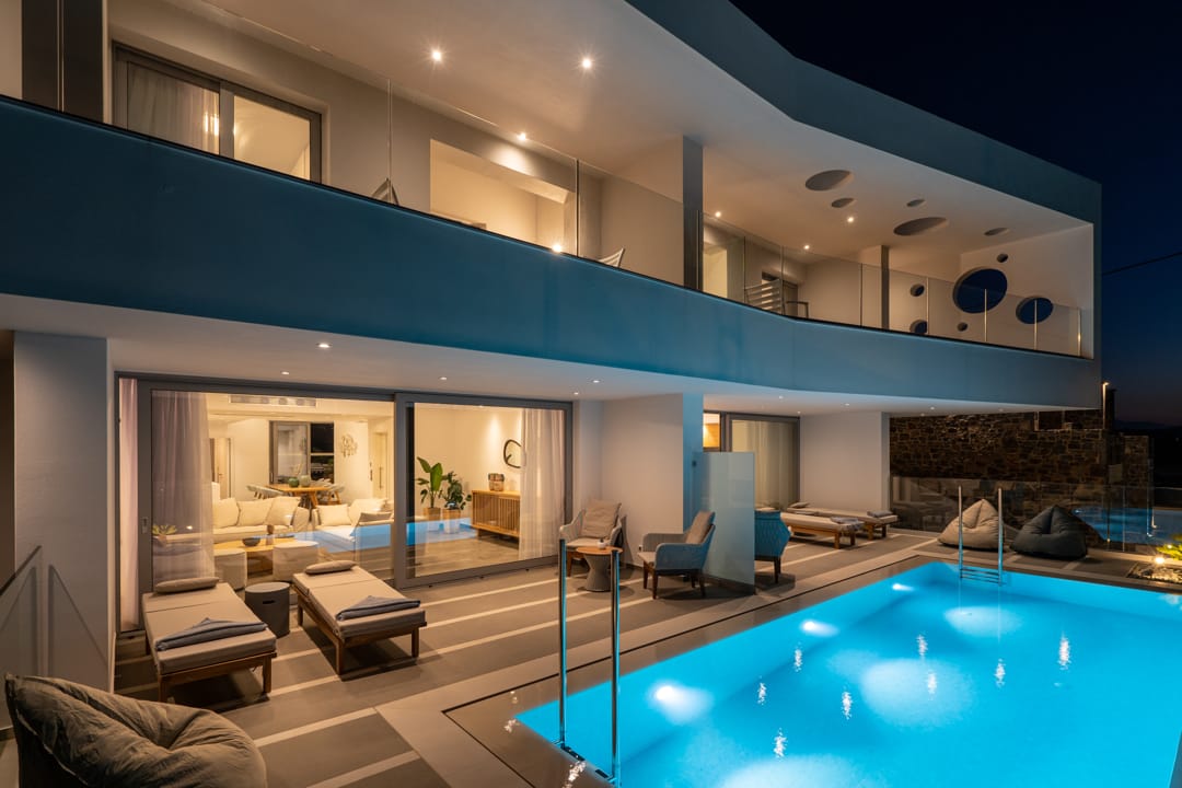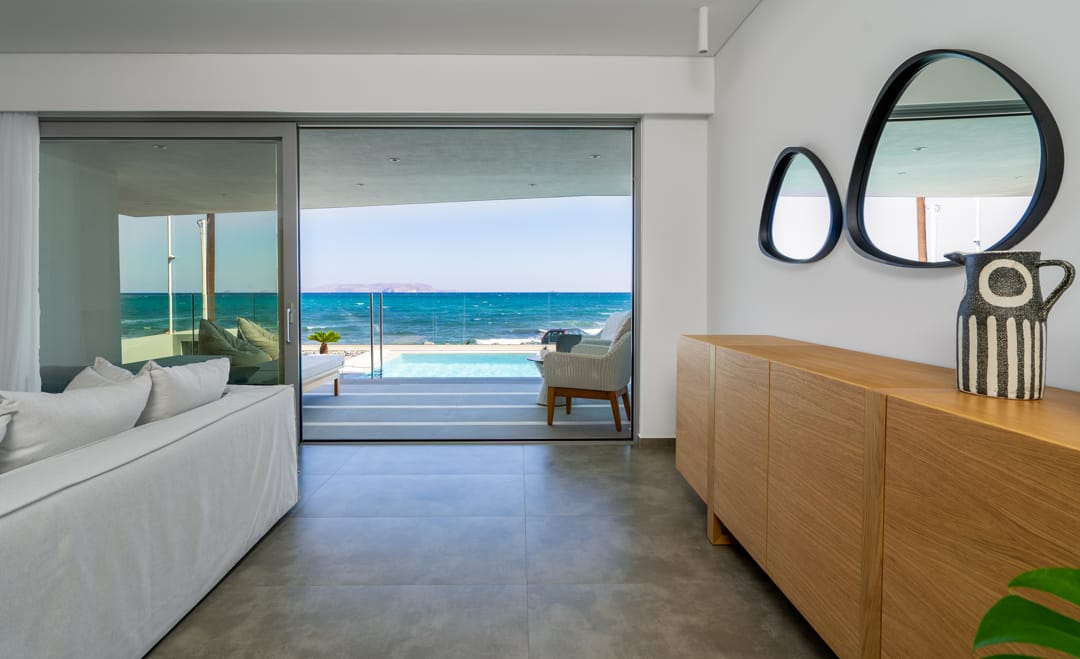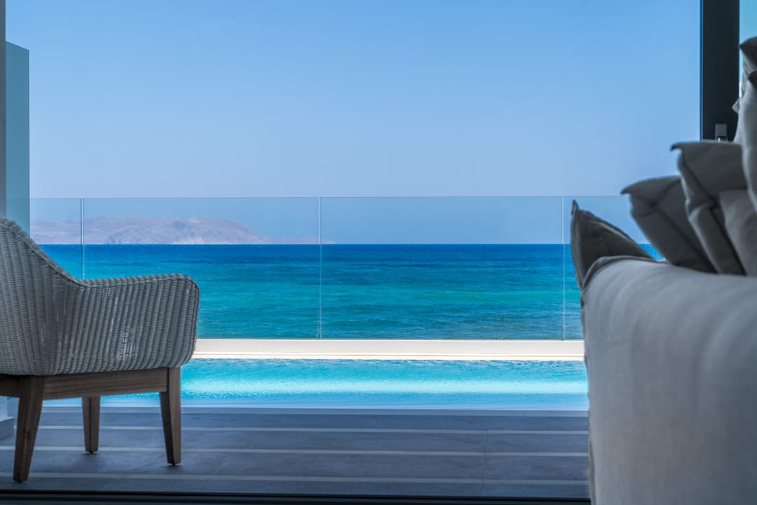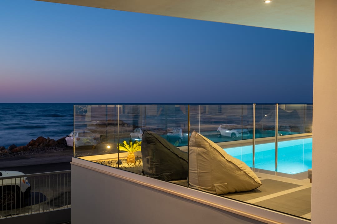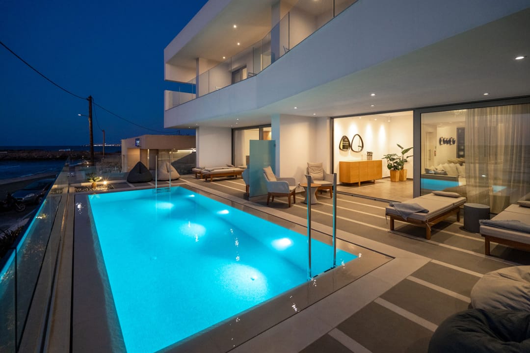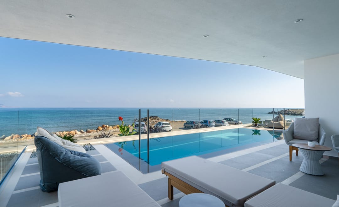 Seafront luxury villa Zeus with 6 bedrooms, a swimming pool, and stunning endless views of the sea, in the village of Gouves, Crete Island for rent.