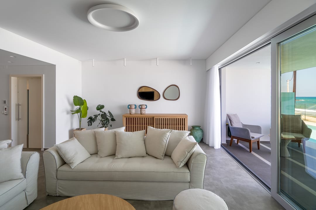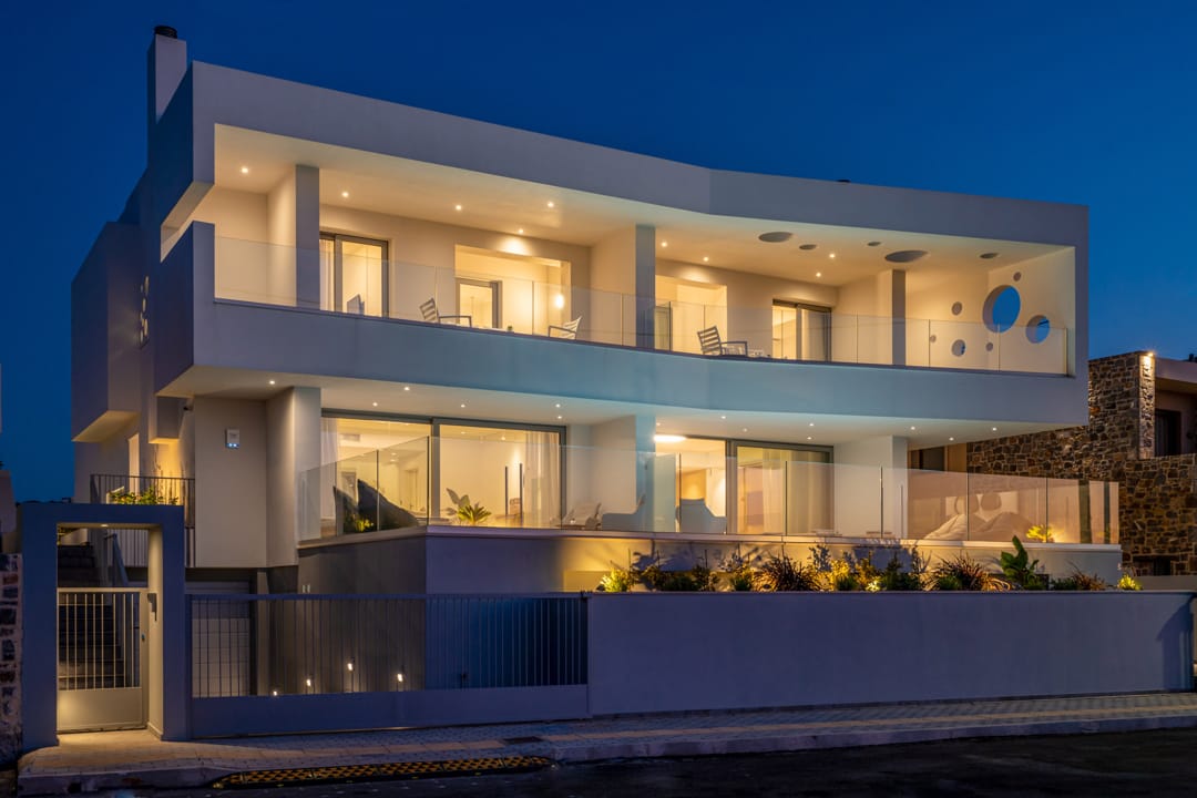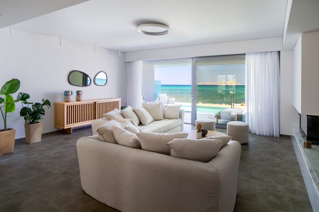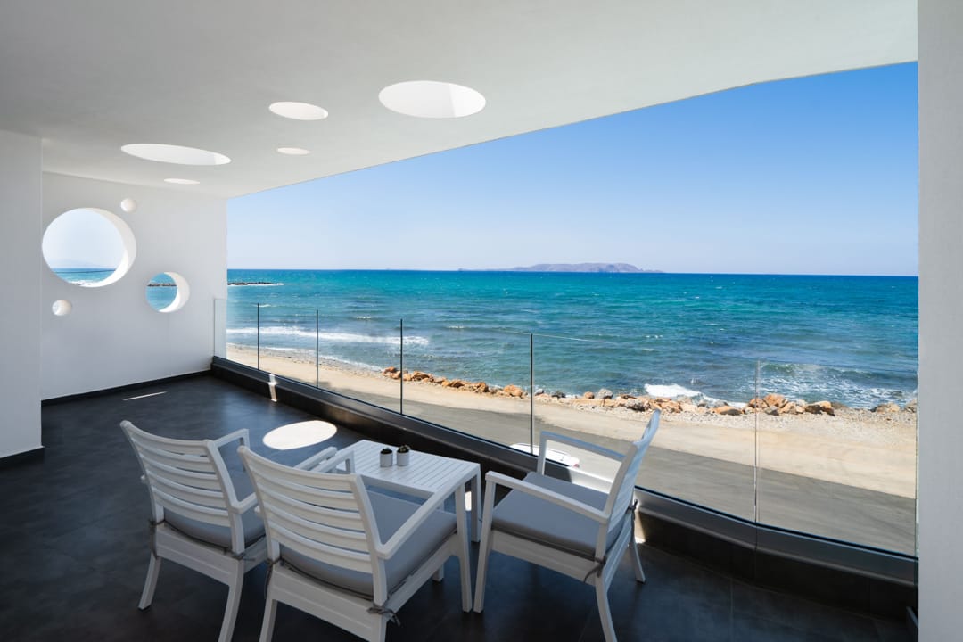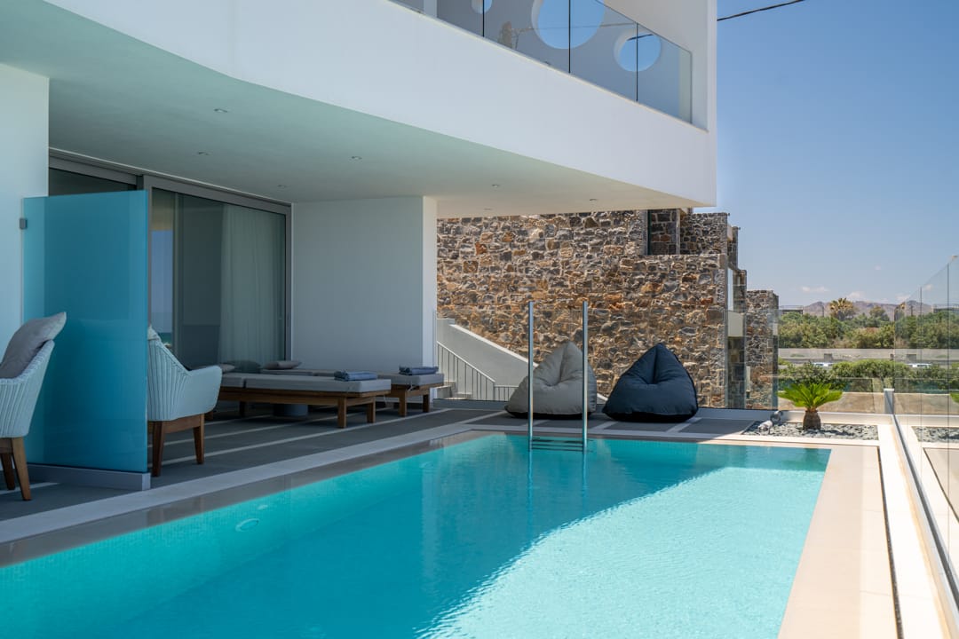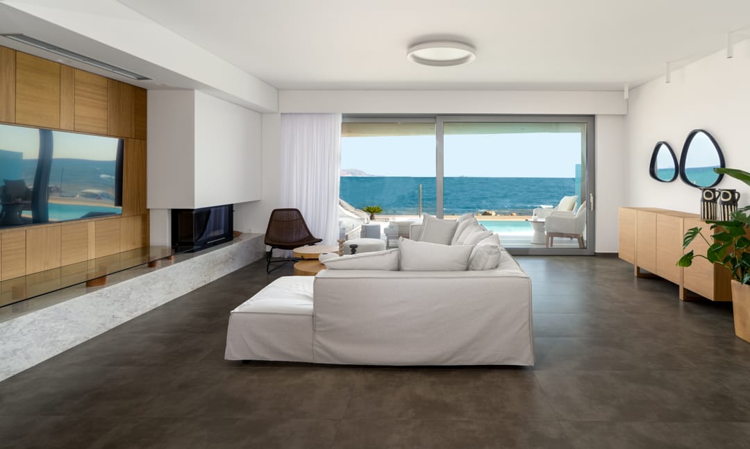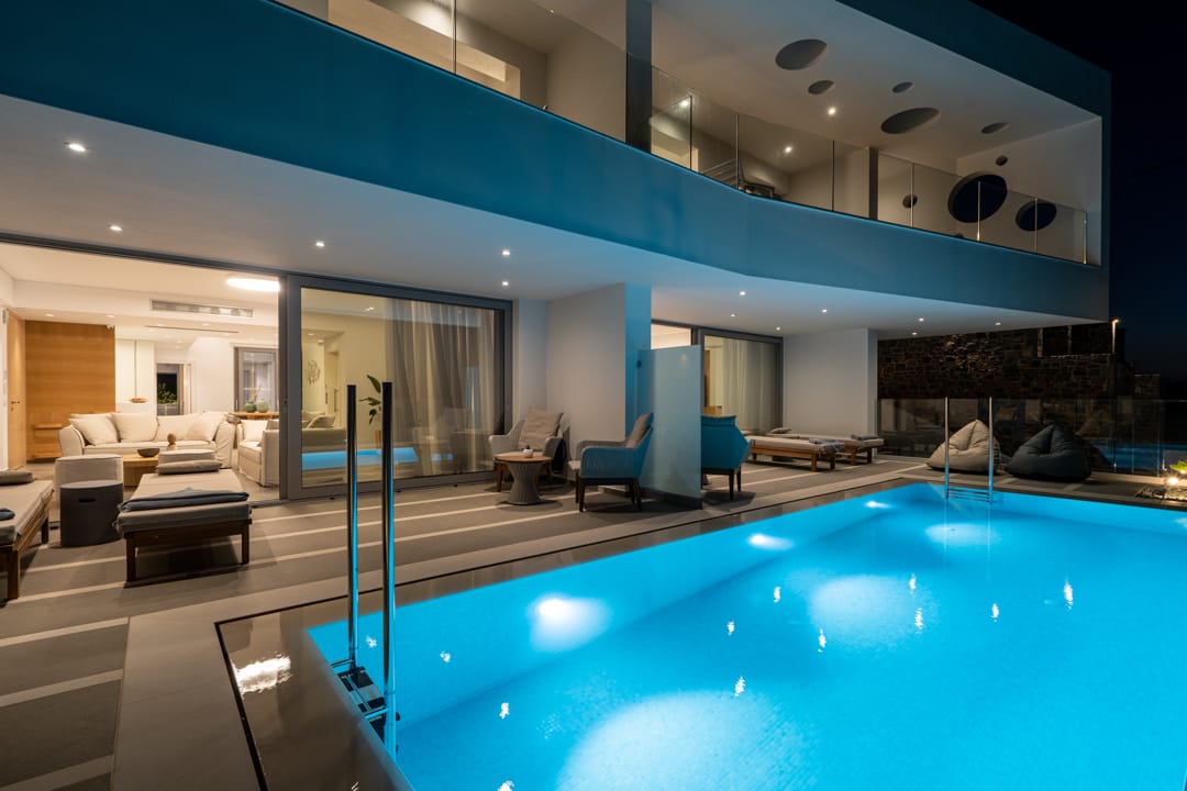 Seafront luxury villa Zeus with 6 bedrooms, a swimming pool, and stunning endless views of the sea, in the village of Gouves, Crete Island for rent.