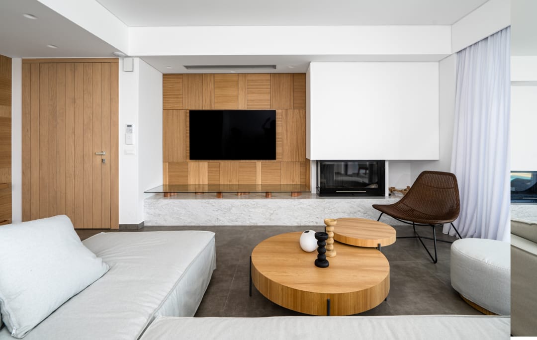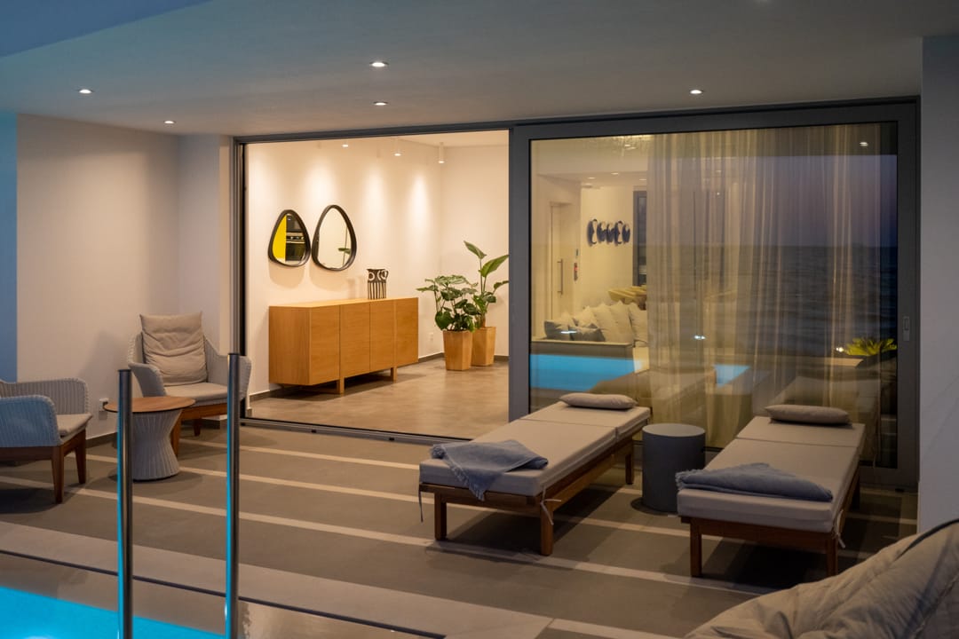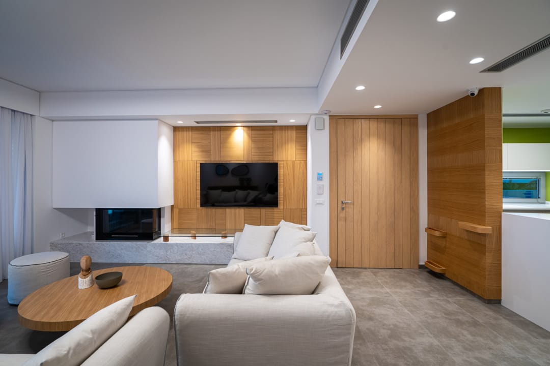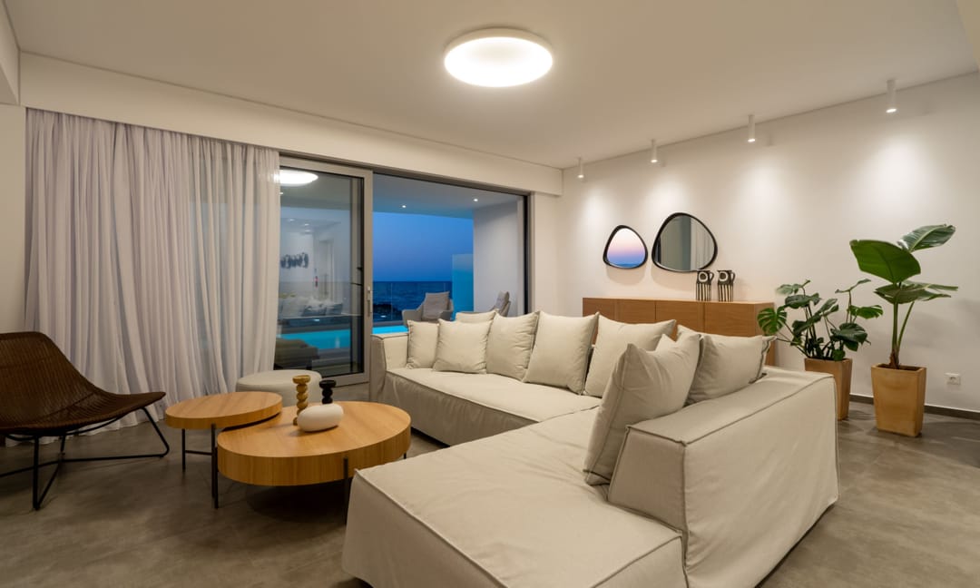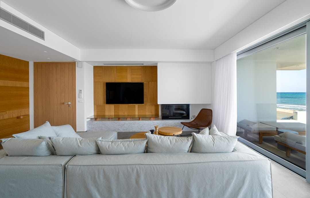 - Living area with a 65’’ smart TV, fireplace, corner sofa, and coffee table, as well as direct access to the pool