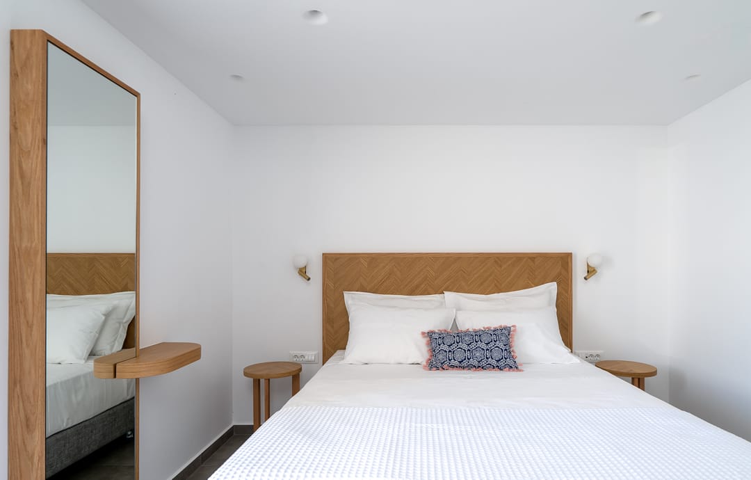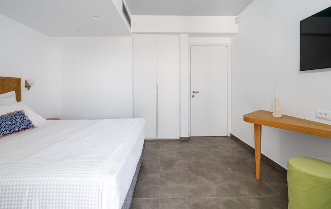 - 2nd bedroom with a double bed (1,60 X, 2,00) with top mattresses, wardrobes and individually controlled A/C, a 43’’ smart TV