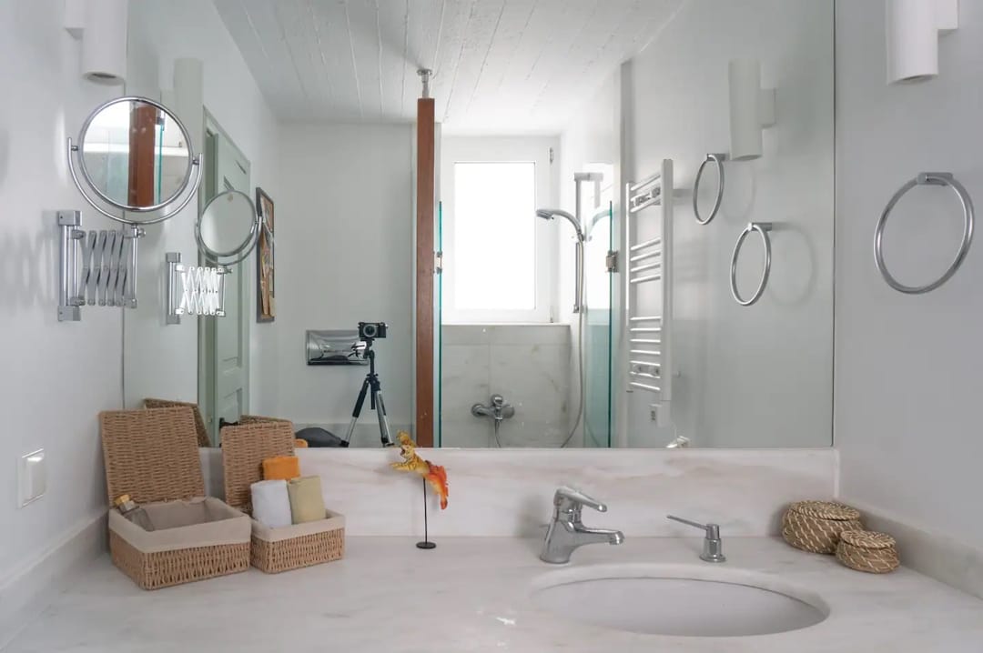 The house’s interior is designed in a modern minimalist style, featuring predominantly white tones.