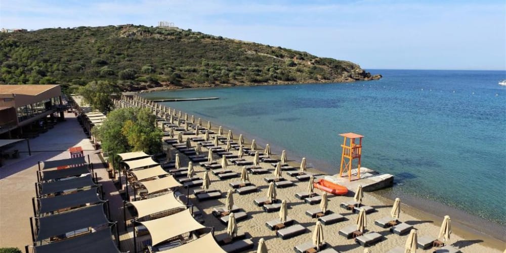 Прекрасная бухта с ухоженной территорией и песчаным пляжем. Виды на храм Посейдона и восхитительные закаты делают это место уникальным.