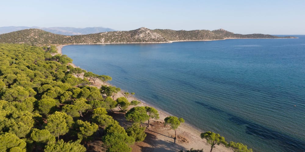 Удивительный песчаный пляж в сосновом бору. Мелководье и теплое море делают его идеальным для семей с детьми. В лесу нет шезлонгов и зонтов, но всегда можно найти тень под соснами. Въезд на пляж запрещен, поэтому машину нужно оставить на парковке вдали от пляжа. Те, кто хочет большего комфорта, могут воспользоваться бич-барами Karavi (Голубой флаг 2024 года), Schinias Bay, Moraitis и Rio de Rizario, расположенными до въезда в лес.