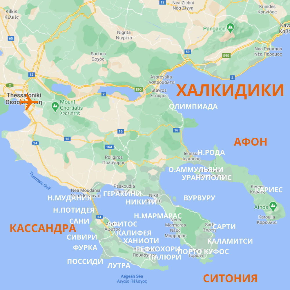 Полуостров Халкидики часто называют «трезубцем Посейдона», так как он делится на три маленьких полуострова, так называемых пальца – Кассандра, Ситония и Афон.