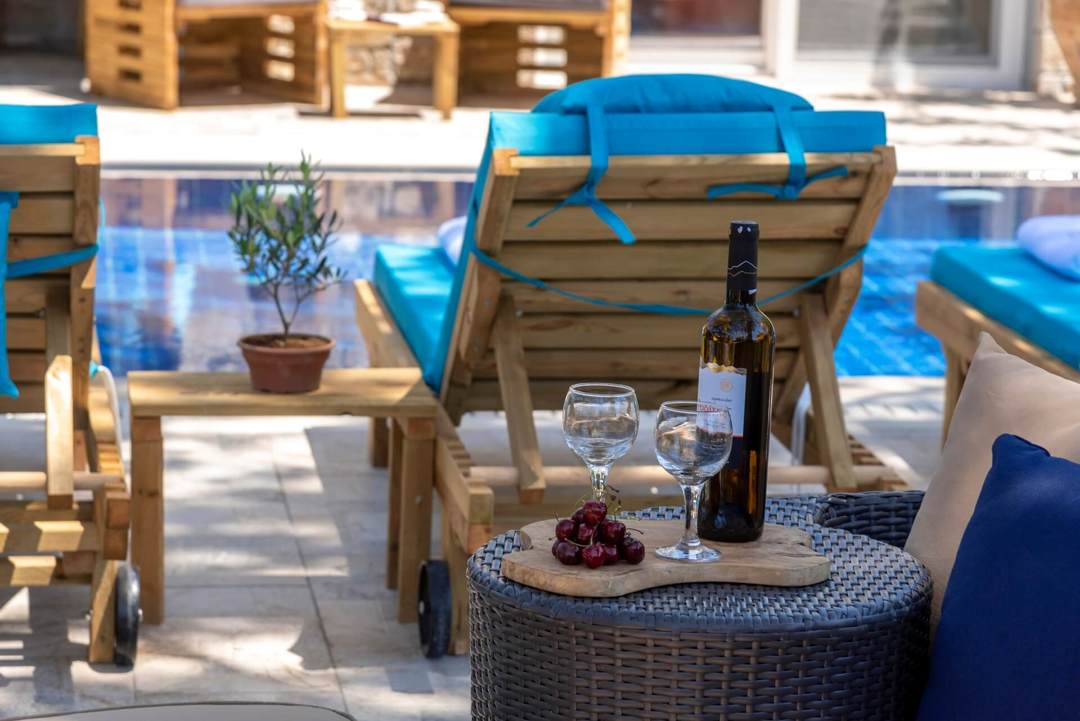 - Бассейн (20 кв.м) с шезлонгами и зонтиками