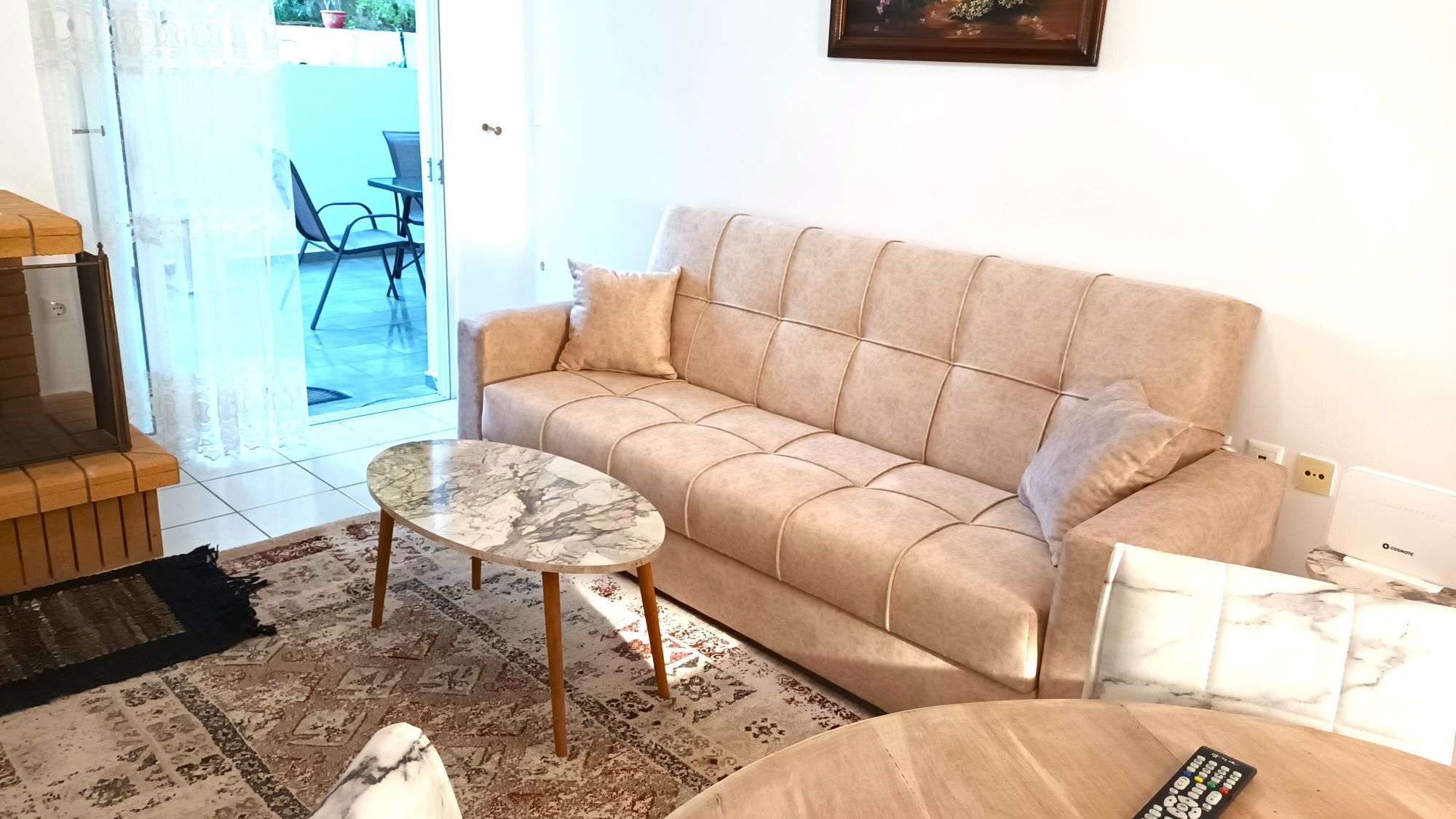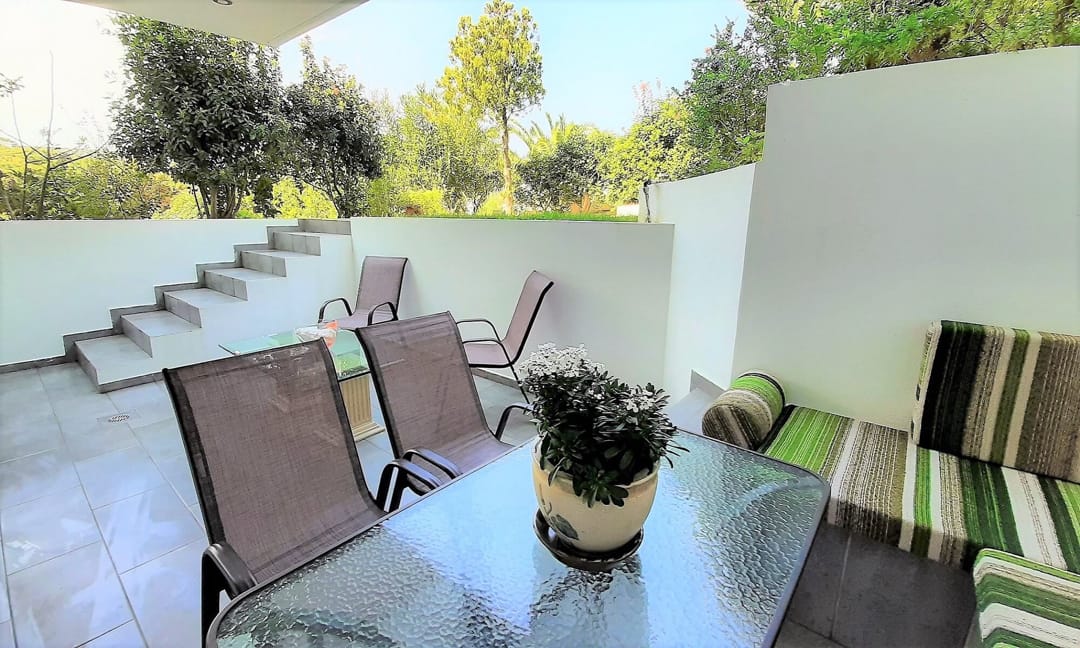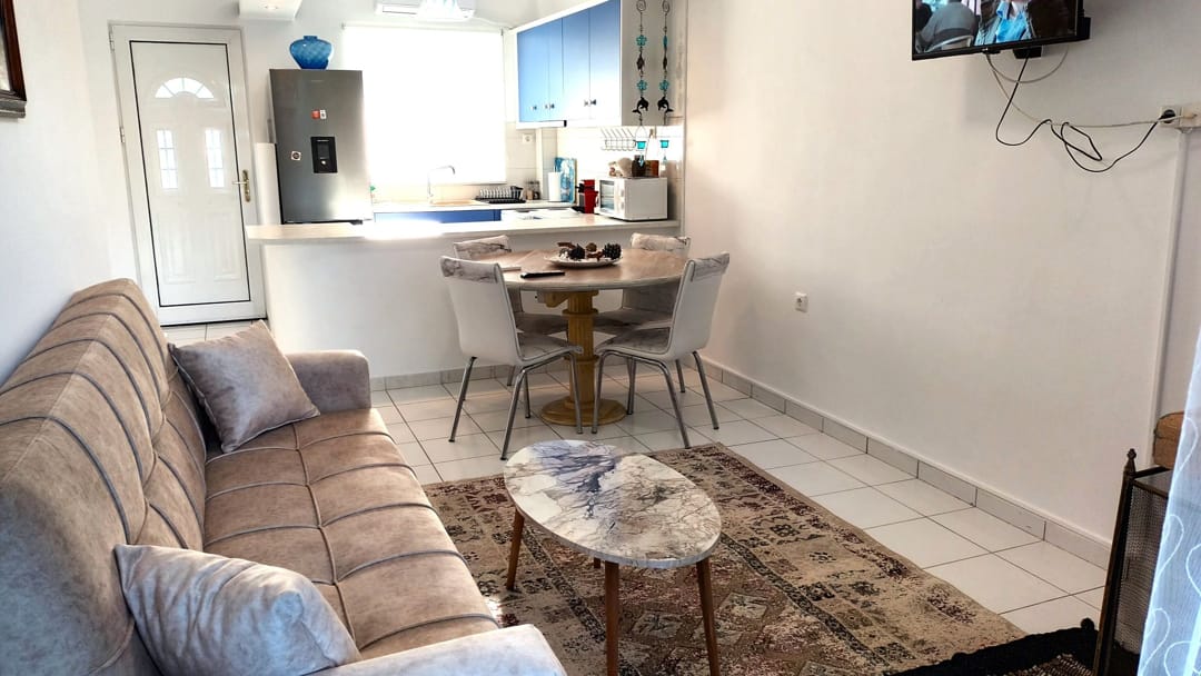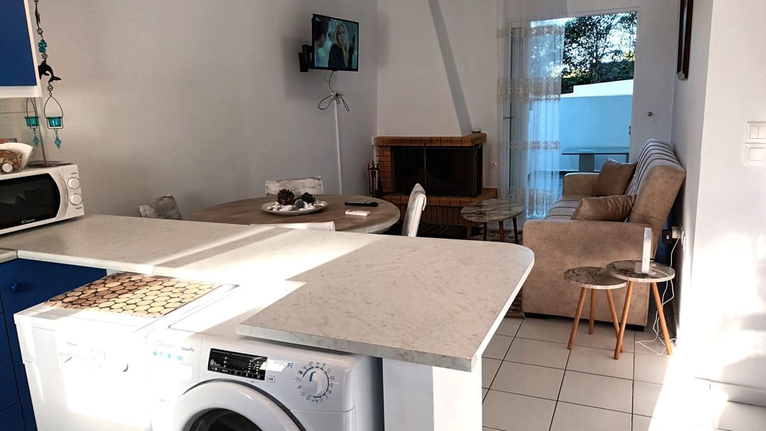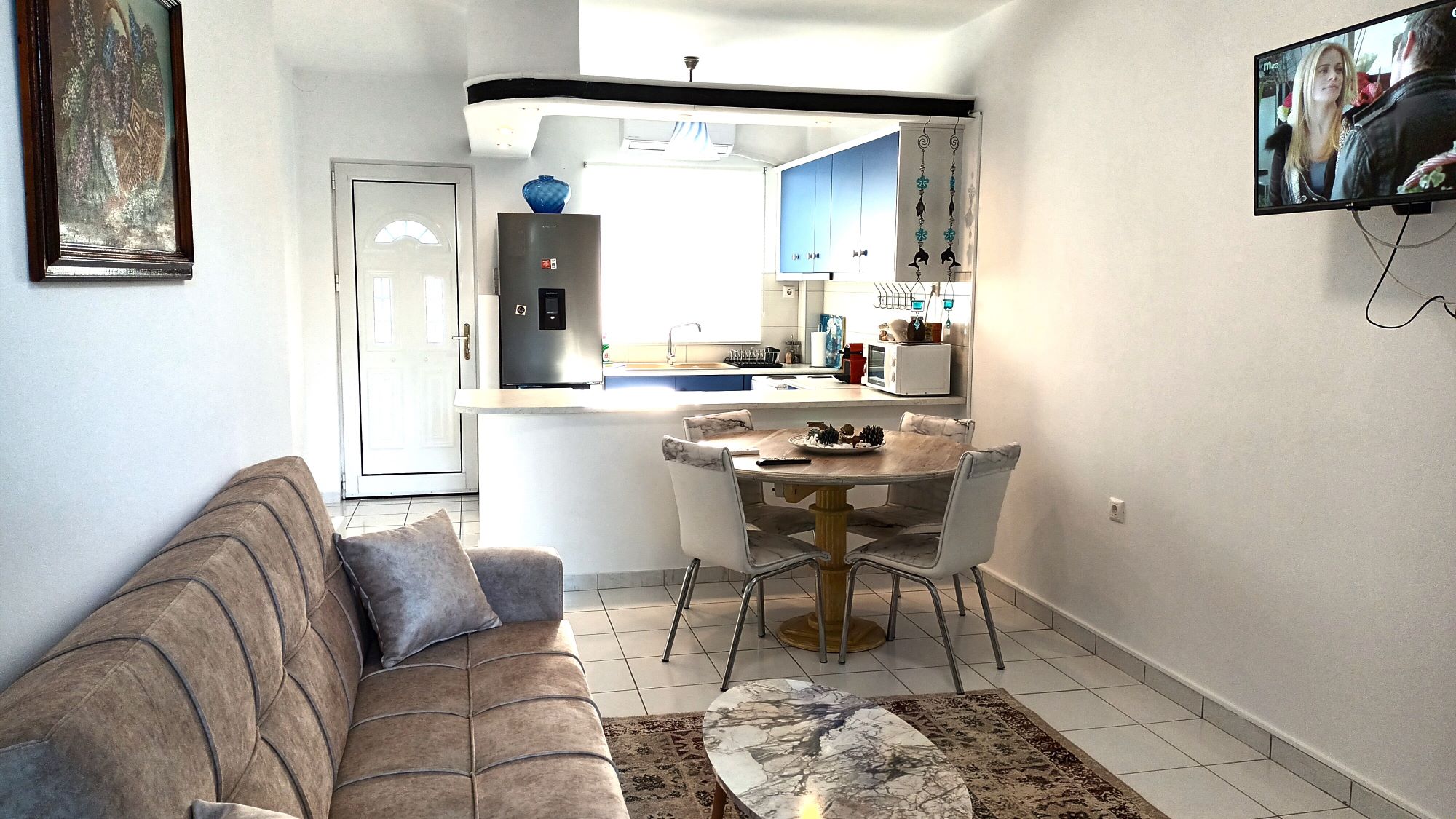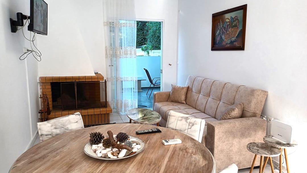 Апартамент расположен на первом этаже комплекса, имеет две большие терассы в передней и задней части дома, а также зелёный дворик с газоном и тенью деревьев, где могут играть дети. Ближайший пляж Ассимаки песчаный и неглубокий, идеальный для детей любого возраста. Выход к пляжу по тропинке, между комплексом и пляжем нет дороги. На расстоянии 100-300 метров имеются ещё несколько красивых бухт с песчаными пляжами для уединённого купания.