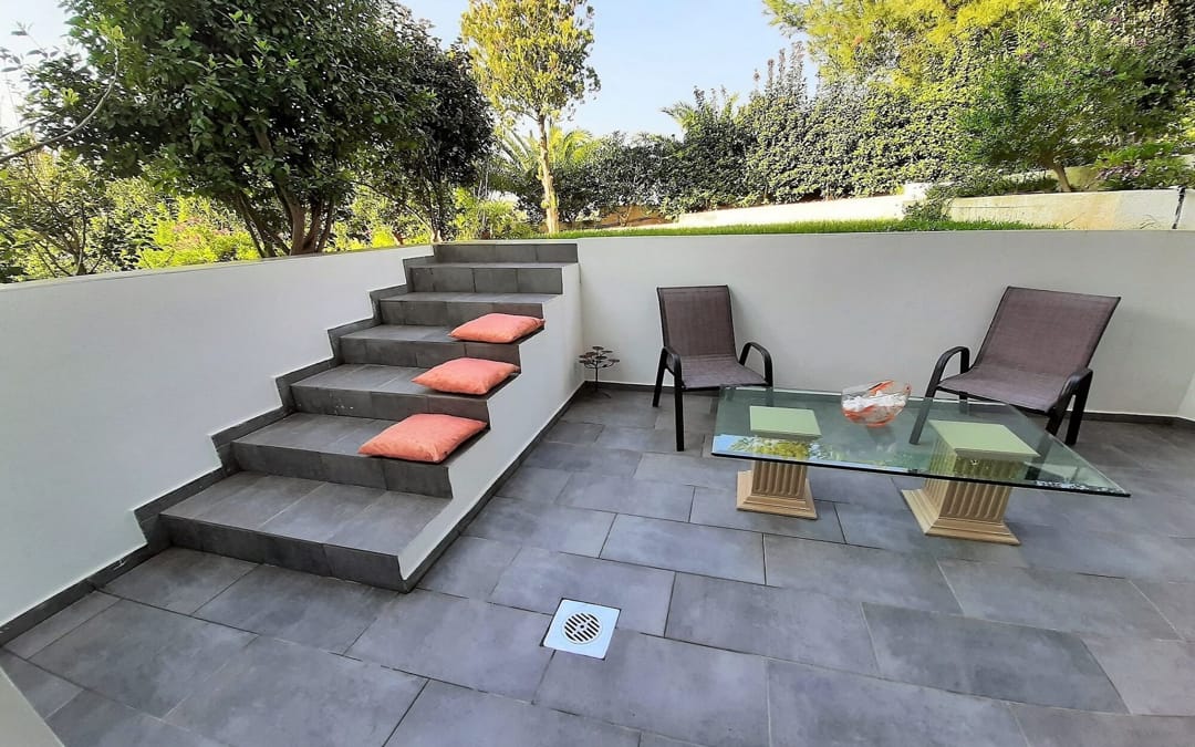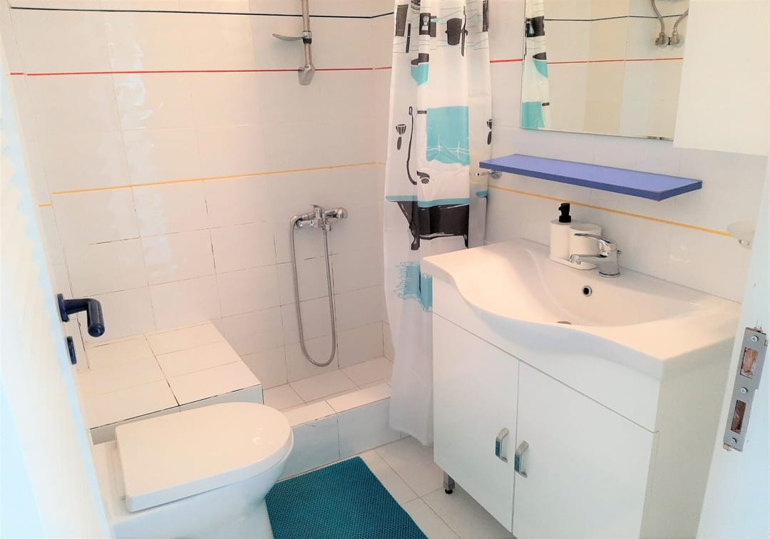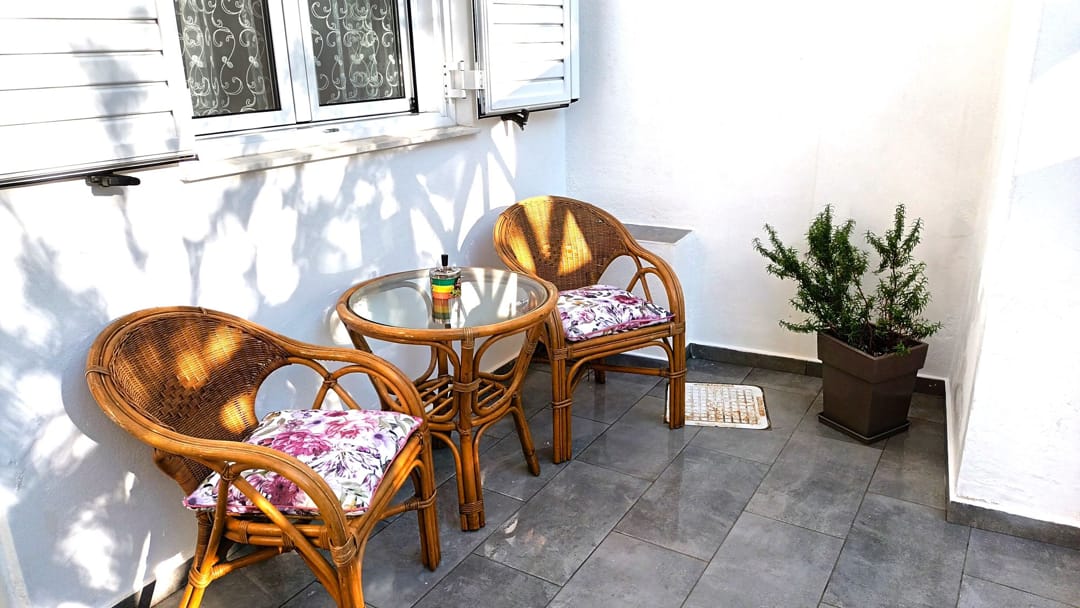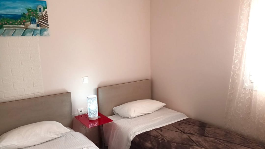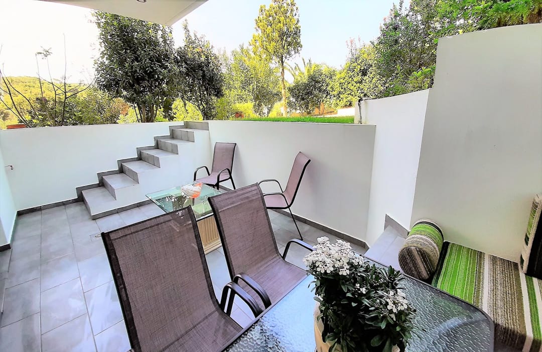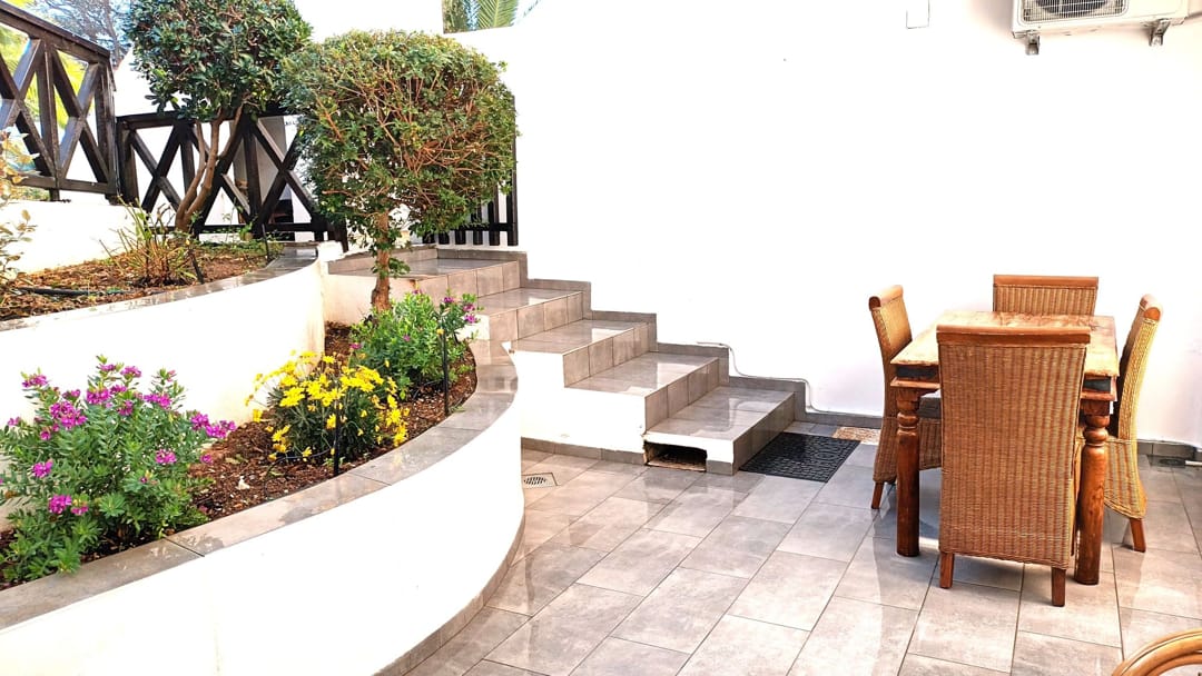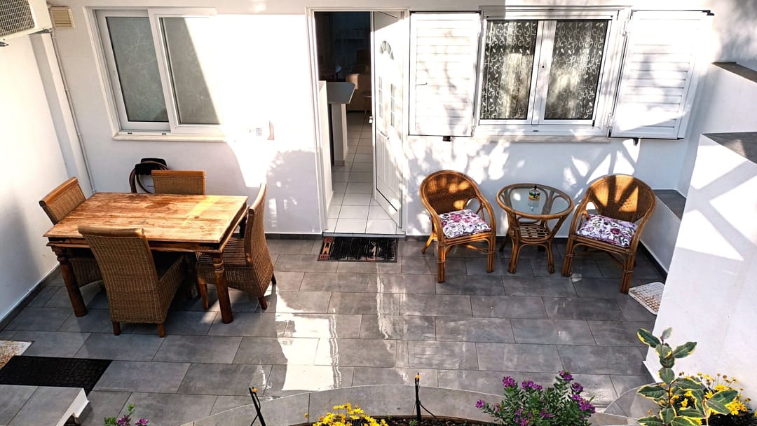 Апартамент расположен на первом этаже комплекса, имеет две большие терассы в передней и задней части дома, а также зелёный дворик с газоном и тенью деревьев, где могут играть дети. Ближайший пляж Ассимаки песчаный и неглубокий, идеальный для детей любого возраста. Выход к пляжу по тропинке, между комплексом и пляжем нет дороги. На расстоянии 100-300 метров имеются ещё несколько красивых бухт с песчаными пляжами для уединённого купания.