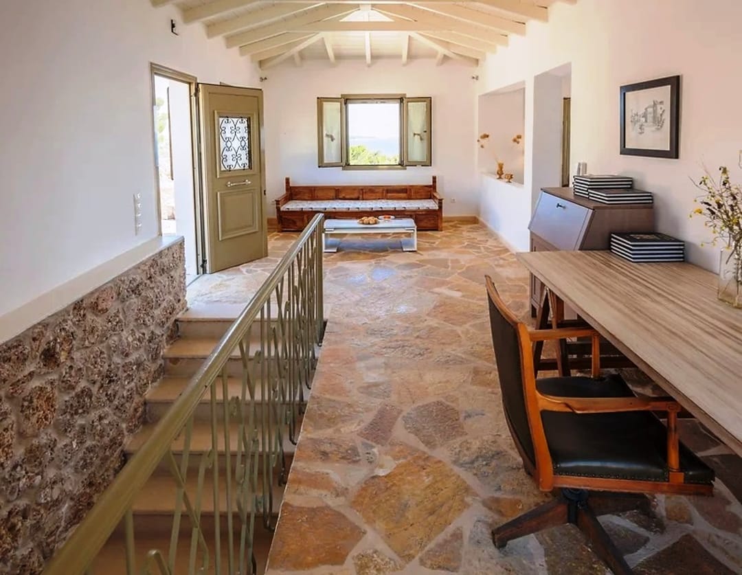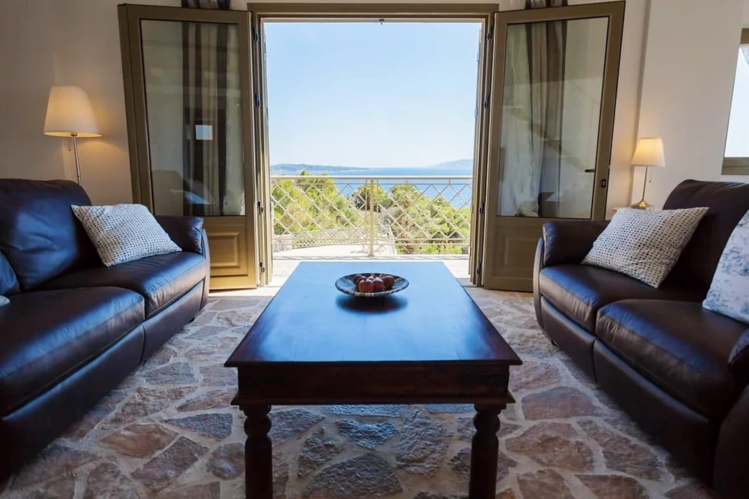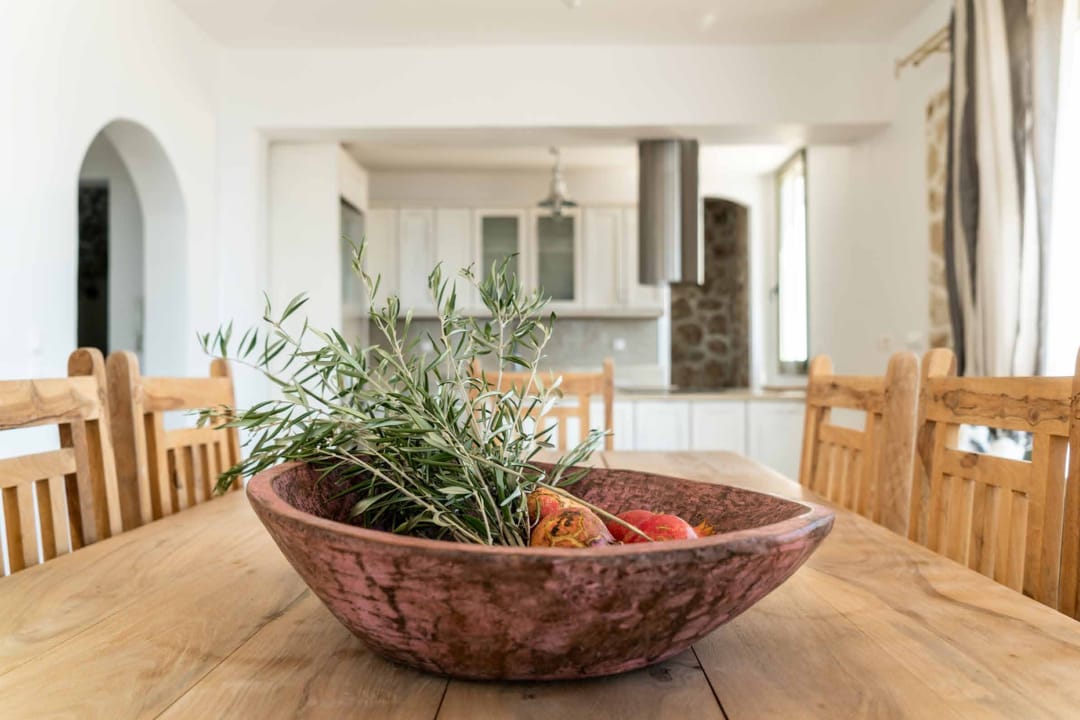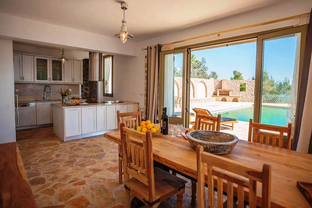 Дизайн виллы выполнен в традиционном стиле этого региона с использованием натуральных материалов, которые прекрасно сочетаются с окружающей средой. Интерьеры украшены мебелью и предметами ручной работы. Неповторимая аура виллы позволяет гостям расслабиться и насладиться уникальным видом на Эгейское море, близлежащие острова и пышный сосновый лес. Просторные гостиные с большими обеденными зонами и удобными диванами создают идеальную атмосферу для проведения отпуска с близкими людьми.