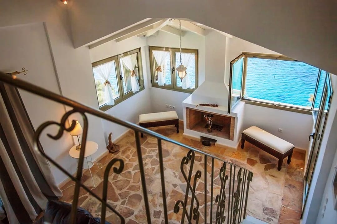 - Гостиная с камином, диванами, телевизором и балконом с видом на море