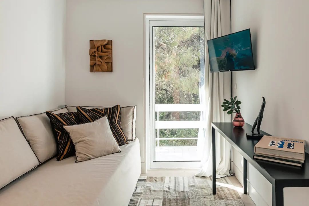 Апартамент находится в комплексе, в окружении соснового леса. Просыпайтесь под щебетание птиц и наслаждайтесь спокойным отдыхом вдали от суеты, но в тоже время в нескольких минутах ходьбы от пляжей Мегало Кавури и Крабо, а также ресторанов, кафе и всего остального, что может предложить этот прекрасный район. На пляже Мегало Кавури есть несколько пляжных баров, оборудованных шезлонгами и зонтиками, в то время как часть пляжа остается неорганизованной. Также здесь расположены 2 таверны и детская площадка.Семьям нравится мелководье и песчаный берег, а также несколько скалистых мест для дайвинга. Небольшой пляж Крабо идеально расположен в уединенной бухте. Одноименный пляжный бар оформлен в цветах, сочетающихся с окружающей природой, и отличается простой, но шикарной эстетикой.