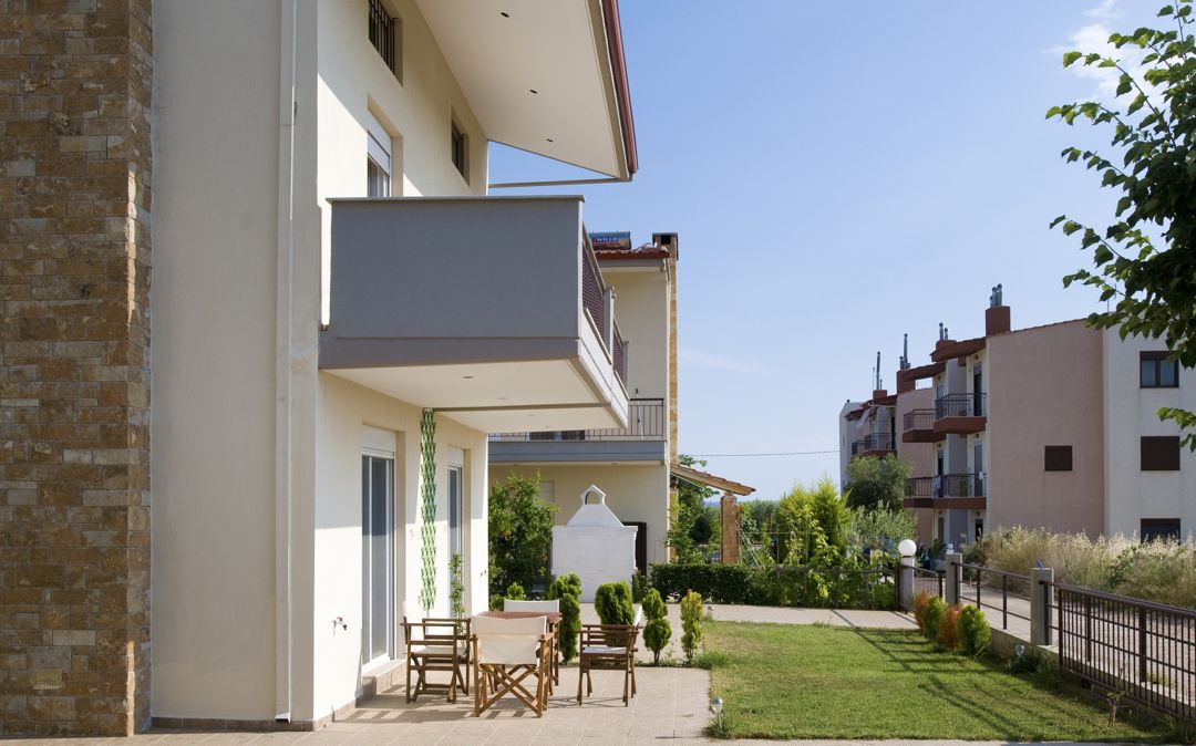 Комплекс располагается на просторной зеленой территории с большим ухоженным газоном, многочисленными фруктовыми деревьями и цветами, создающими атмосферу уюта и комфорта. Это идеальное место для семей с маленькими детьми, которые могут безопасно играть во дворе.