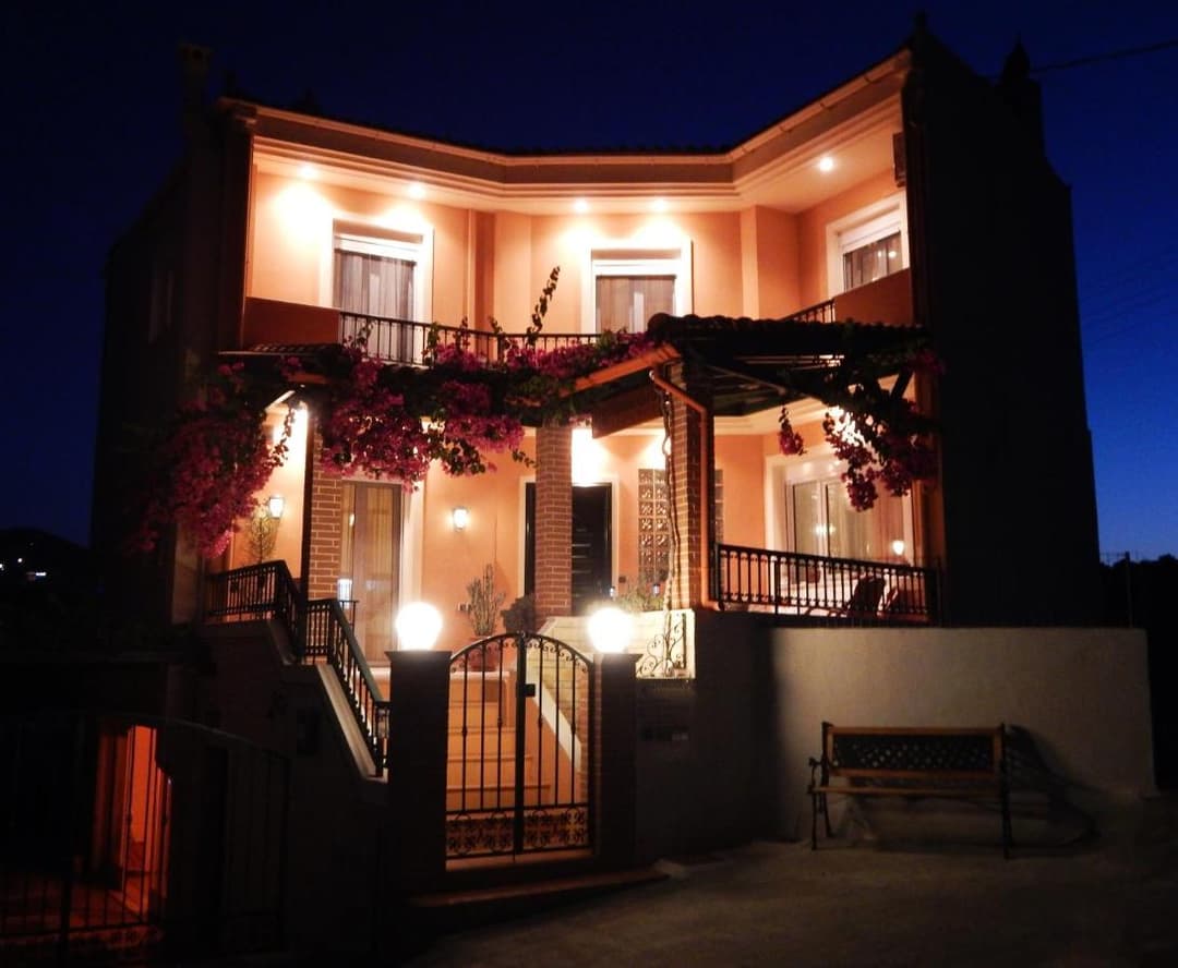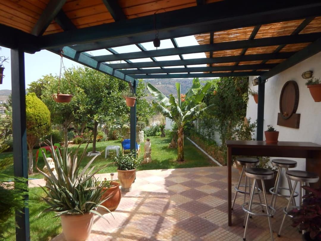 Двухэтажный дом красиво оформлен в теплых тонах и обладает уютной, домашней атмосферой. Снаружи есть большой зеленый сад с меблированной террасой, беседкой, обеденной мебелью и барбекю. С балконов открывается потрясающий вид на бескрайнее синее море.