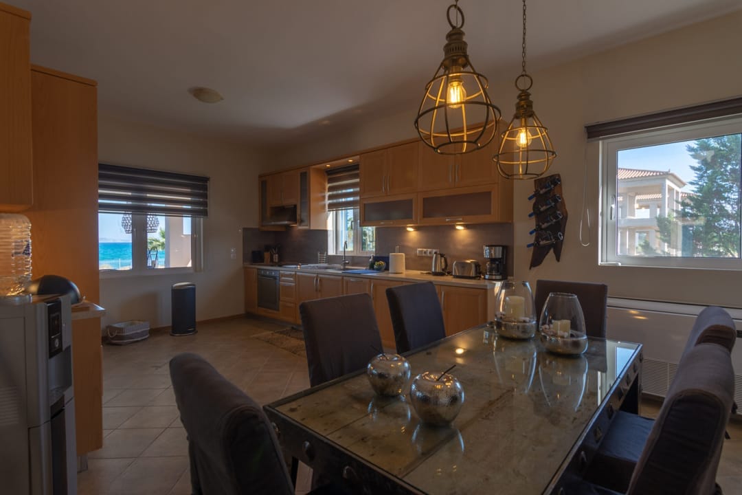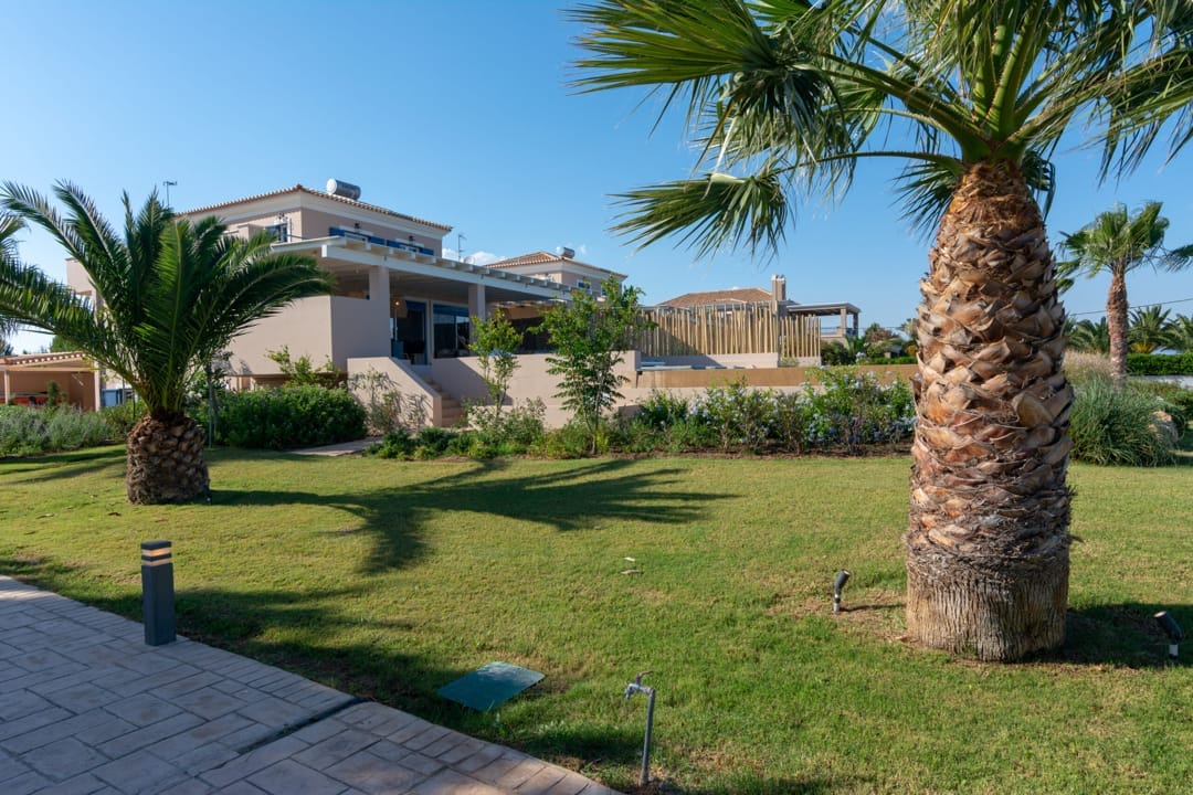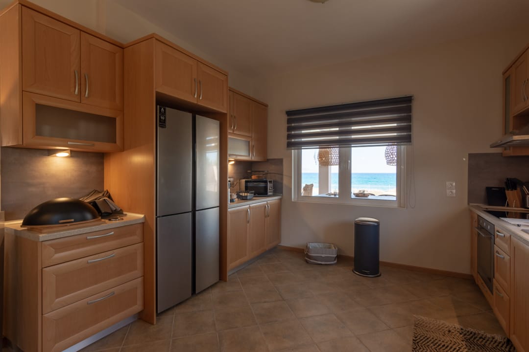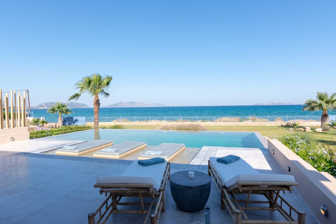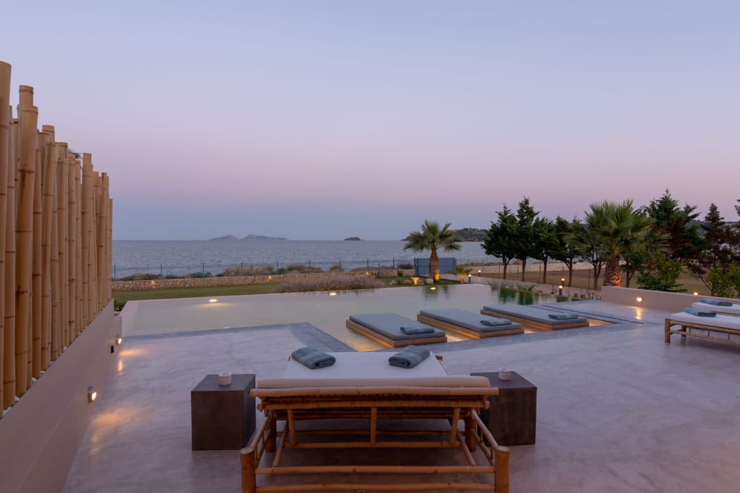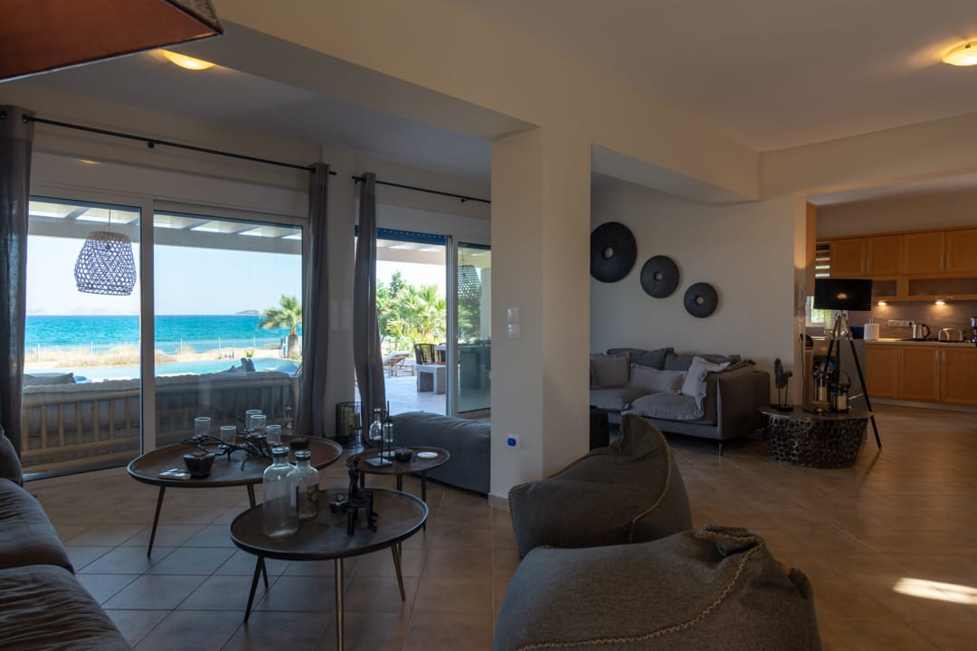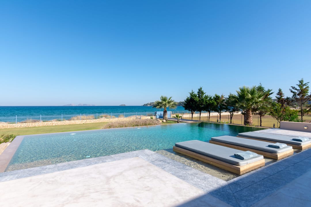 Вилла находится непосредственно на берегу моря, предлагая роскошный и спокойный отдых. Лишь небольшая дорожка отделяет виллу от песчаного пляжа с собственными зонтиками и шезлонгами. Окруженная оливковой рощей и морем, вилла предоставляет гостям живописную обстановку для расслабленного отдыха.