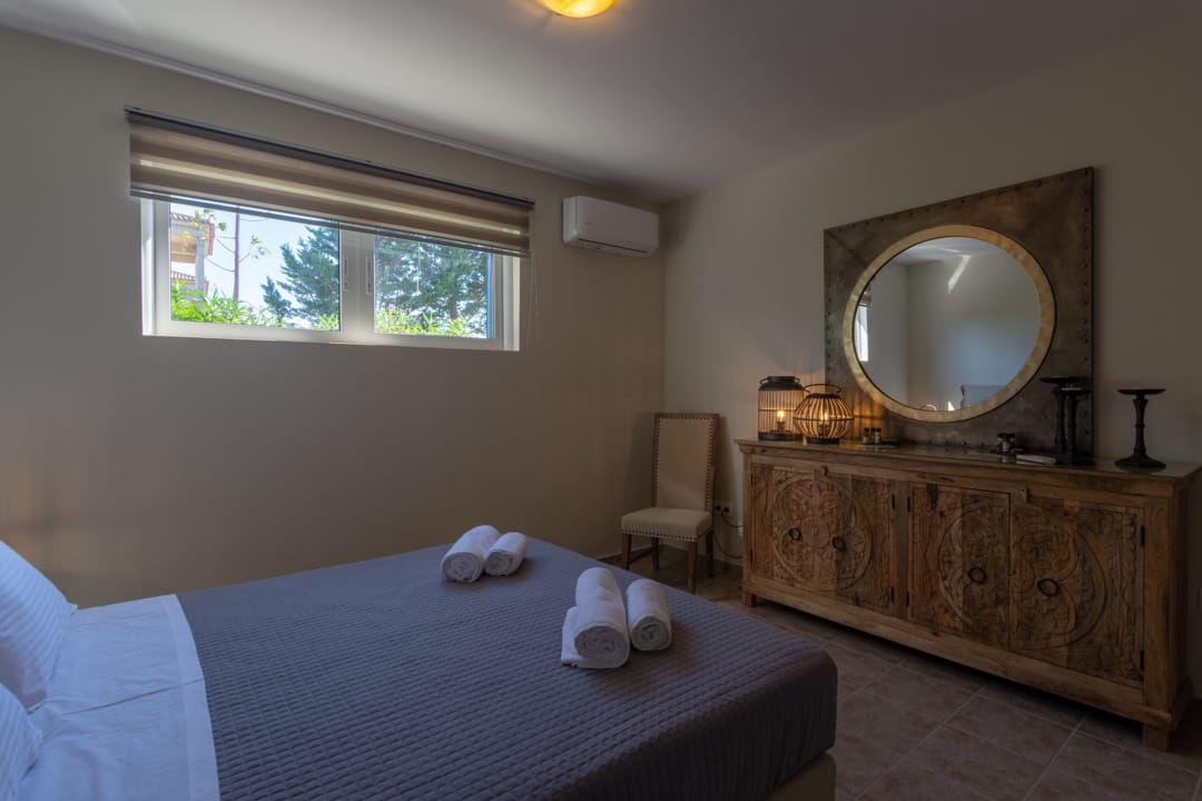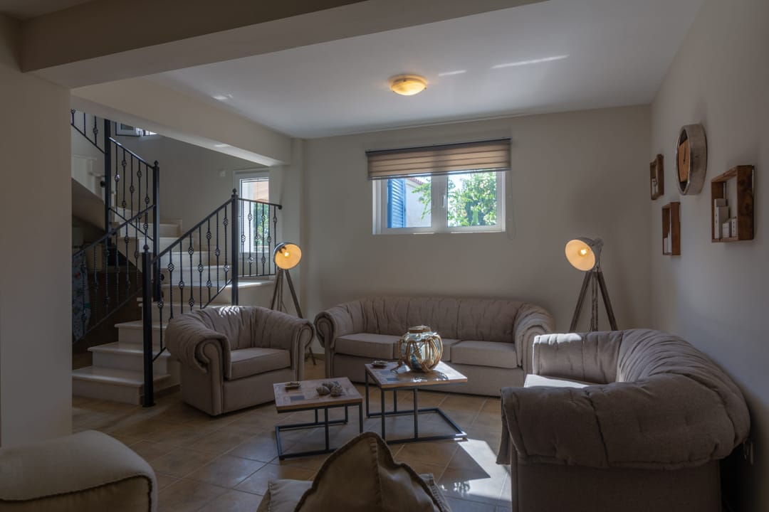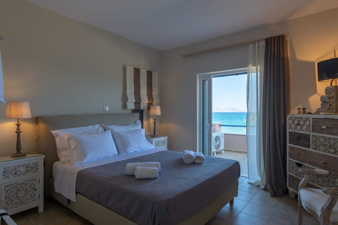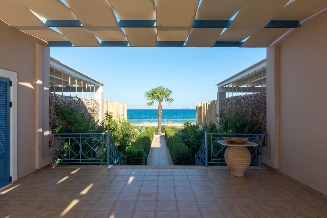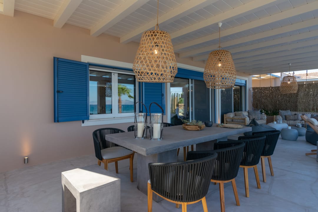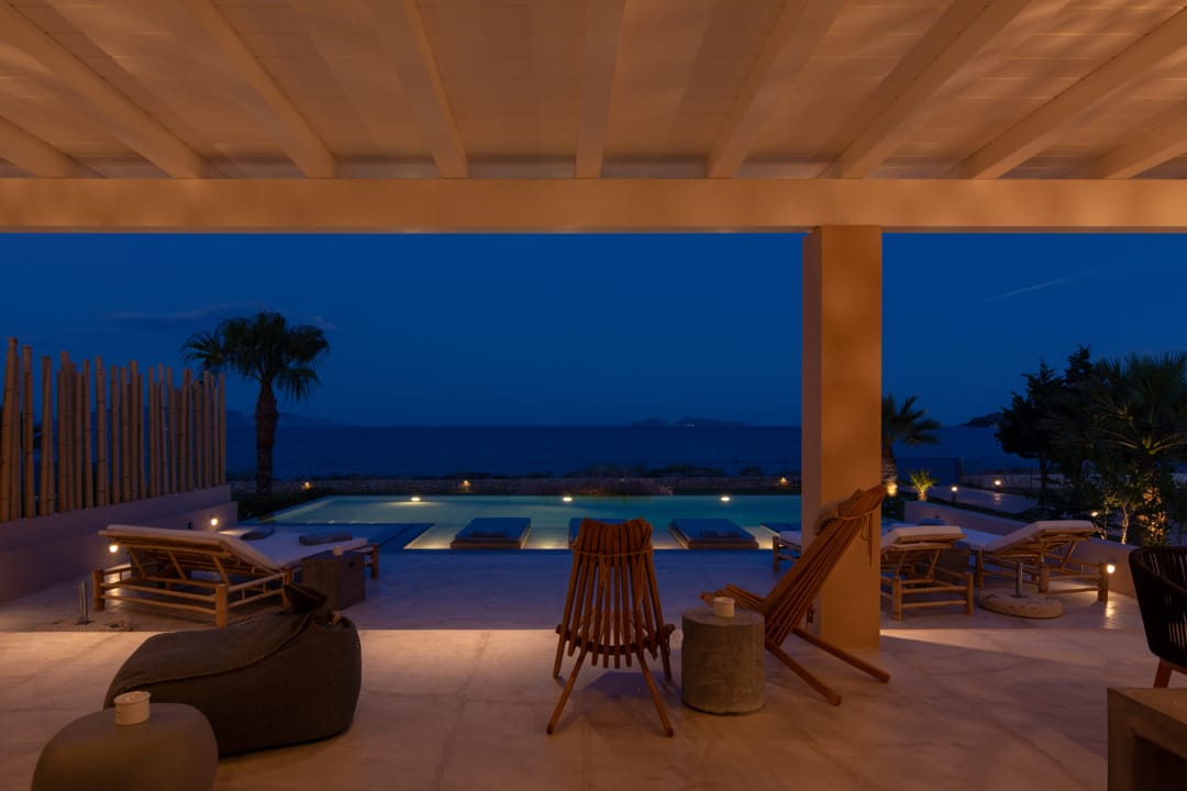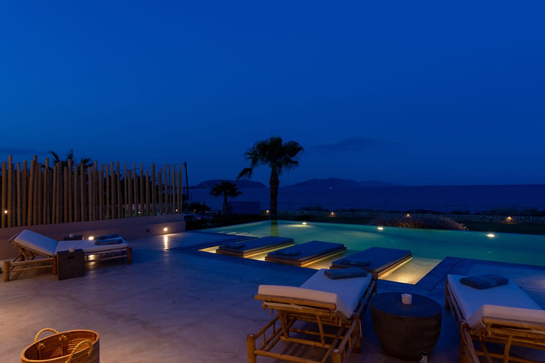 Вилла находится непосредственно на берегу моря, предлагая роскошный и спокойный отдых. Лишь небольшая дорожка отделяет виллу от песчаного пляжа с собственными зонтиками и шезлонгами. Окруженная оливковой рощей и морем, вилла предоставляет гостям живописную обстановку для расслабленного отдыха.
