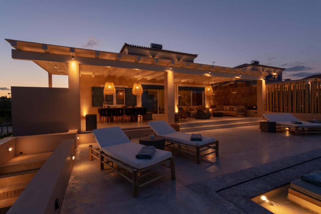 - Раздвижные стеклянные двери отделяют гостиную и столовую от зоны отдыха на открытом воздухе и бассейна