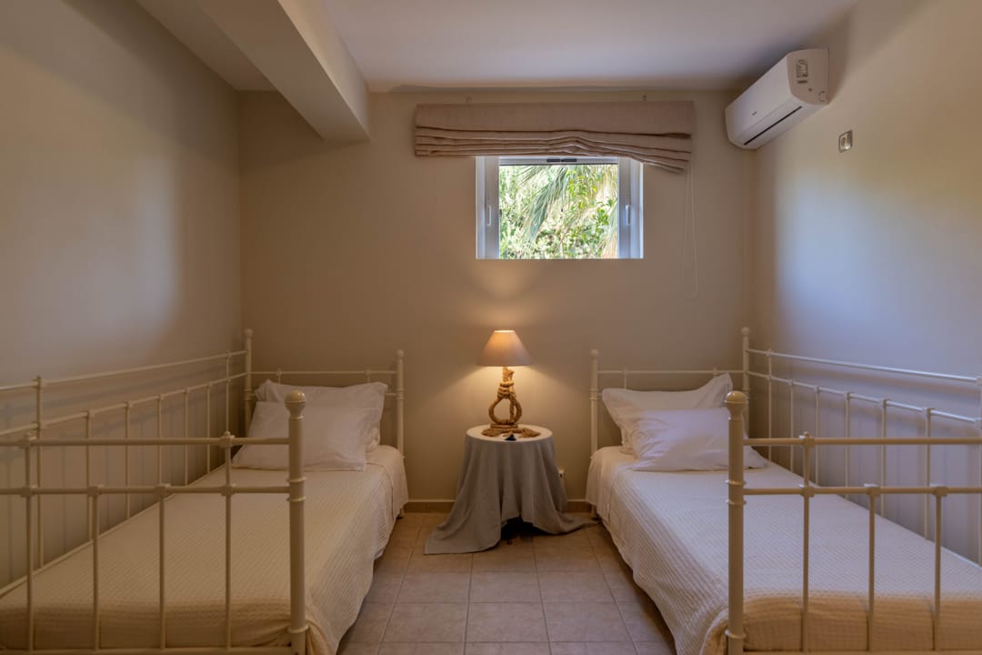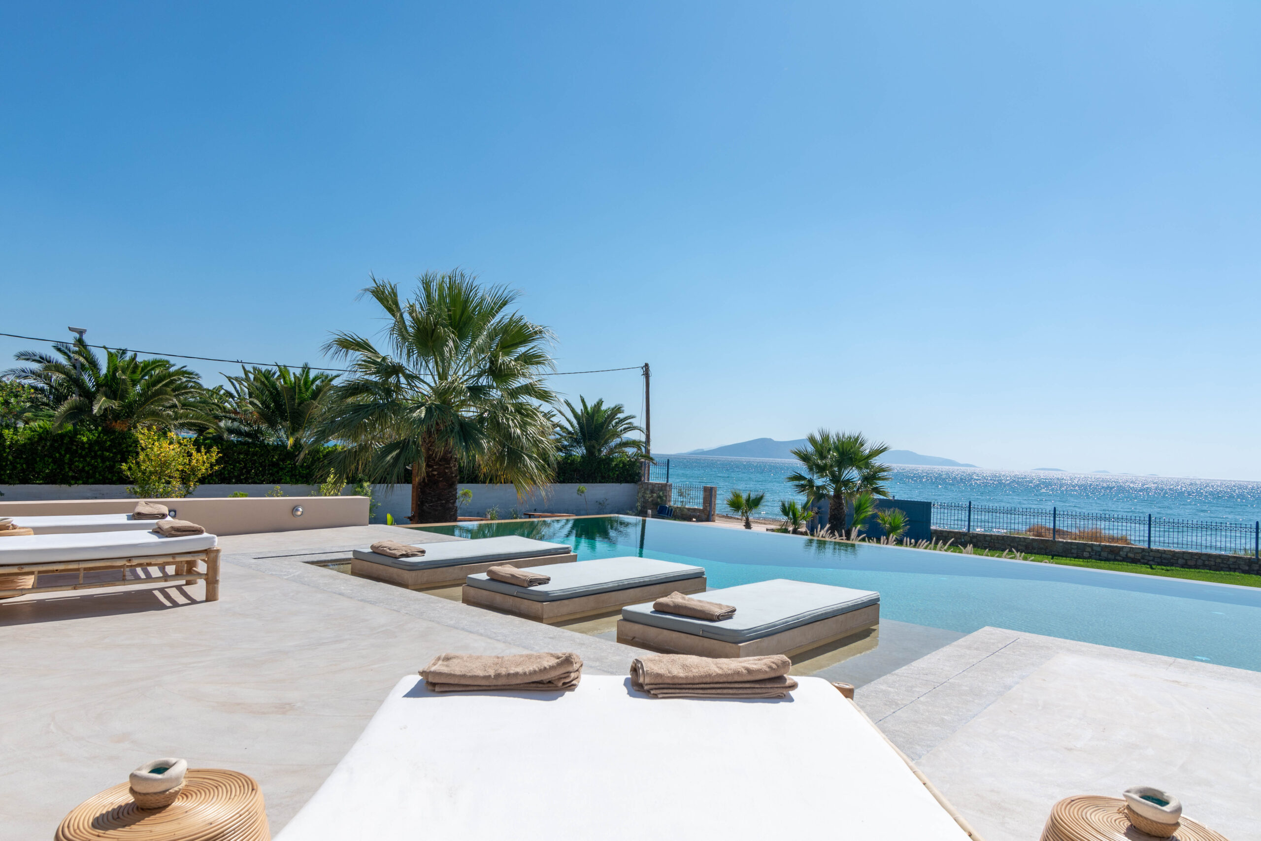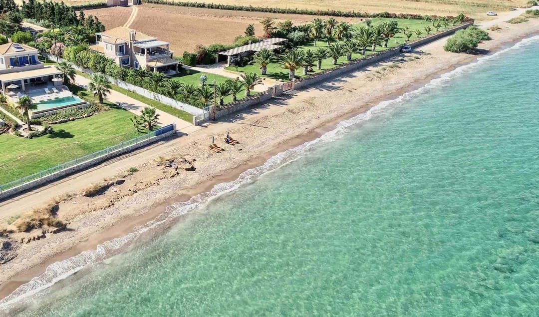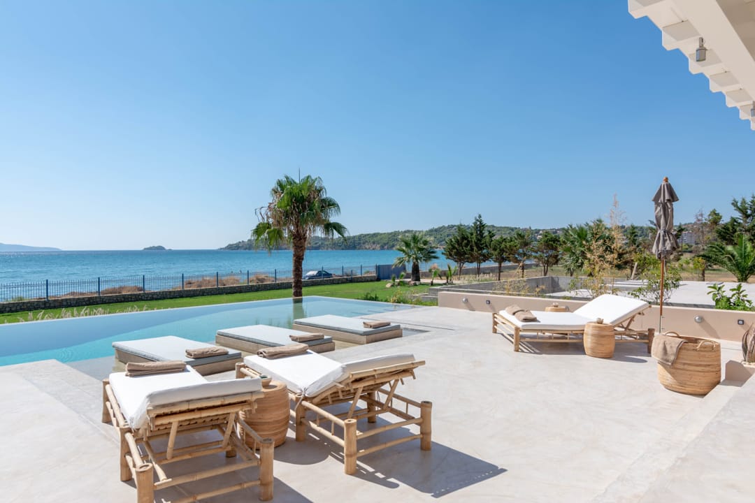 Вилла находится непосредственно на берегу моря, предлагая роскошный и спокойный отдых. Лишь небольшая дорожка отделяет виллу от песчаного пляжа с собственными зонтиками и шезлонгами. Окруженная оливковой рощей и морем, вилла предоставляет гостям живописную обстановку для расслабленного отдыха.