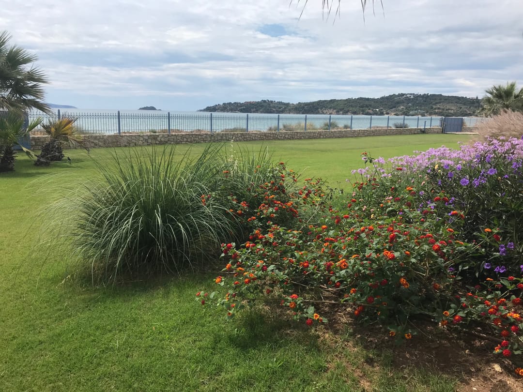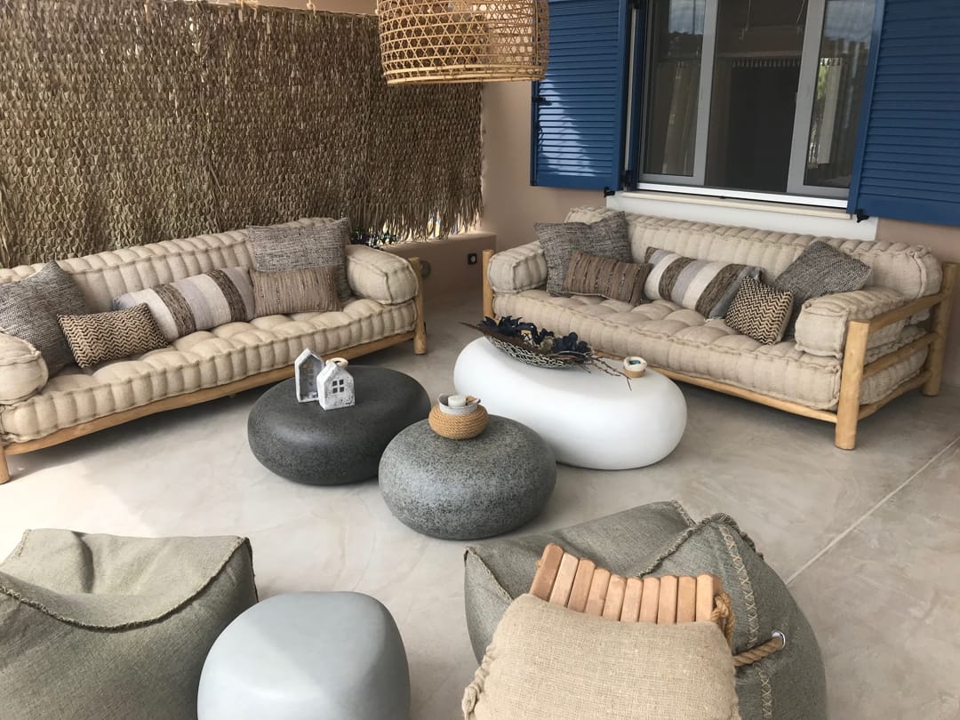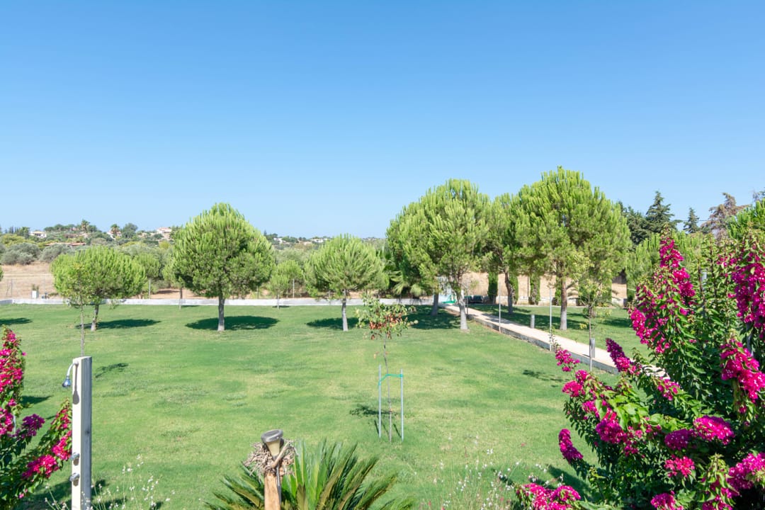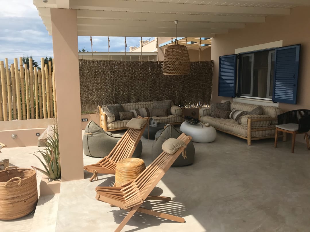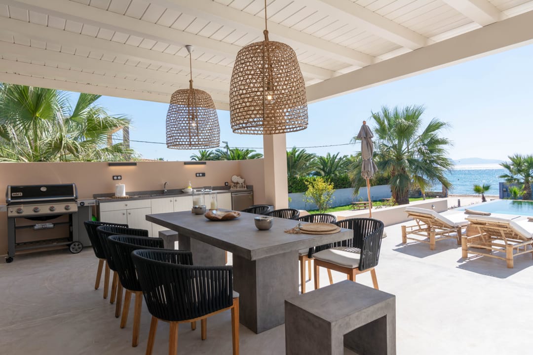 - Огромная веранда с садовой мебелью и видом на сад, бассейн и море